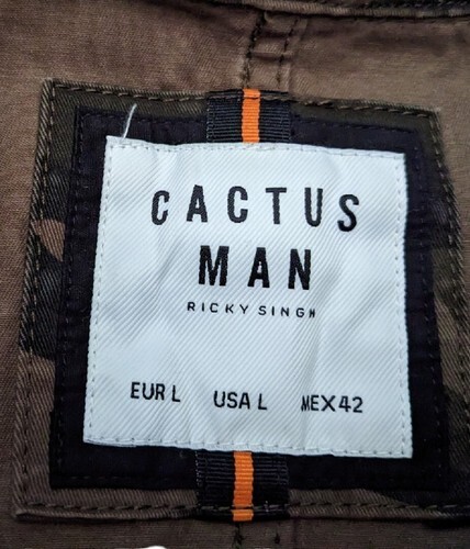 This is a Ricky Singh CACTUS MAN Camo Jacket Sz Large (Runs Small). Military Style. Please note that although this jacket is a size large I feel like it runs slightly smaller. Take note of the measurements. From armpit to armpit flat across the chest while buttoned up is 23 in. From shoulder to shoulder across the top measures about 19 in. From shoulder to the cuff of the sleeve measures approximately 27 in. I would say it fits more like a medium. EXCELLENT CONDITION.