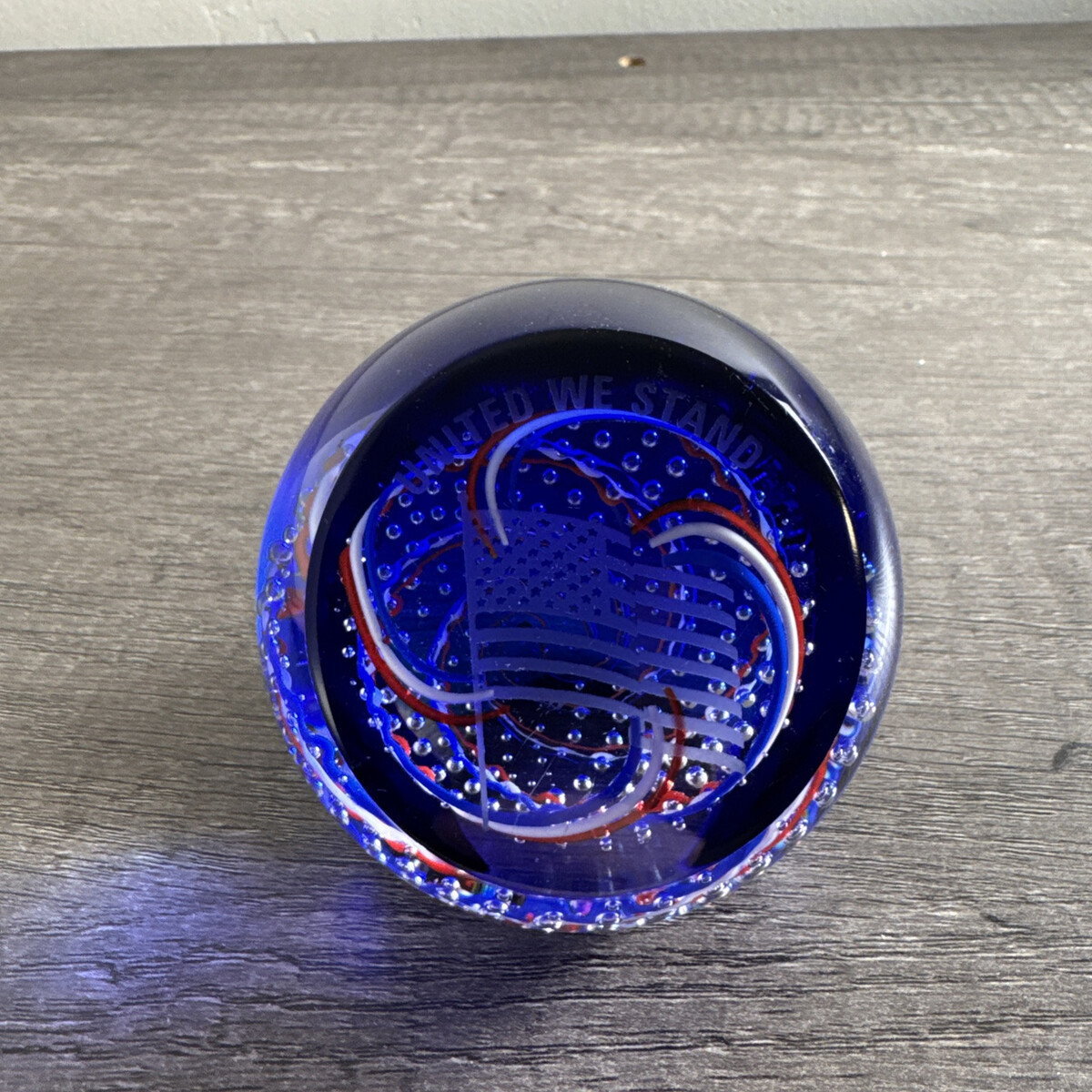 - Caithness Blue "United We Stand" American Flag/Ribbons Glass Paperweight