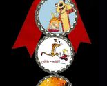 very cool ornament each piece is approx. 1.5 inches round...3 pieces securely attached...lite weight metal pieces....piece of ribbon provided ready for hanging....very clear pictures covered by a dome clear covering hangs approx 4.5 inches long without the ribbon, ribbon adds more length