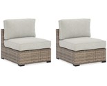 WE DO NOT SHIP TO THE FOLLOWING STATES: DC, ID, MD, ME, MS, NM, SD This cool, casual outdoor chair will raise the comfort level and visual appeal of your outdoor living space. Made of handwoven wicker in easy-going beige tones, the cushioned armless chair blends beautifully into your lanai or pool and patio area with thick, comfy cushions wrapped in Nuvella high performance fabric that is stain resistant, fade resistant and easy to clean. This outdoor chair can be used on its own or paired with other pieces of the matching sectional to create a space that holds up to Mother Nature and ages gracefully for years of enjoyment.Additional Dimensions Seat width: 29" Seat depth: 22.5" Seat height: 17.5" Product Features Set of 2 Loose, reversible cushions Easy-clean polyester (Nuvella) upholstery remains vibrant and resists stains All-weather foam cushion core wrapped in soft polyester Clean fabric with mild soap and water, let air dry; for stubborn stains, use a solution of 4 oz. bleach to 28 oz. water Imported fabric and fill All-weather resin wicker handwoven over rust-free aluminum frame with durable powder coated finish Can be sold individually or with other pieces in the sectional Stainless steel hardware Assembly required Calworth - Beige - Armless Chair w/Cushion (Set of 2)29.0"W x 33.5"D x 33.25"H - 1.0 lb