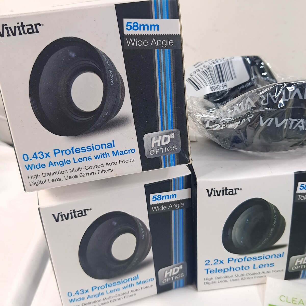 - Camera lens set Nikon Wc-E63 Vivitar 58mm Wide Angle .43x Telephoto 2.2x Hood