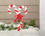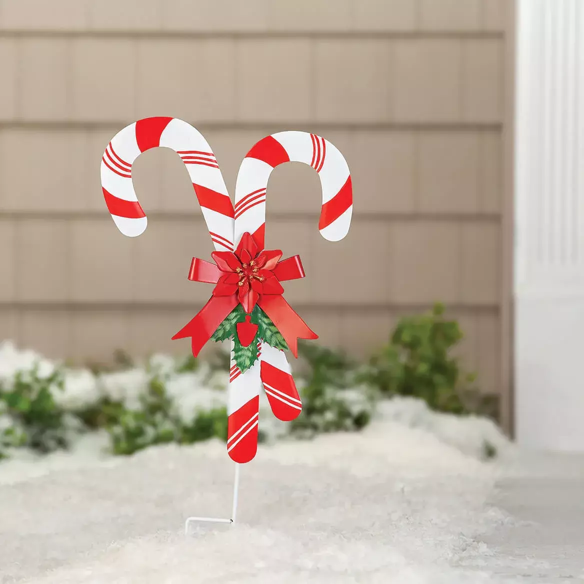 Add this jolly Candy Cane Stake to your outdoor décor for extra holiday spirit. Made from handpainted metal, the candy canes are decorated with a 3D floral bow accent. Place in an outdoor planter or next to your door, or add to an indoor pot. Easy 3-pc. assembly. 100% metal. Christmas decoration measures 12 1/2" wide x 24 1/2" high with included metal stakes. By Fox River Creations.