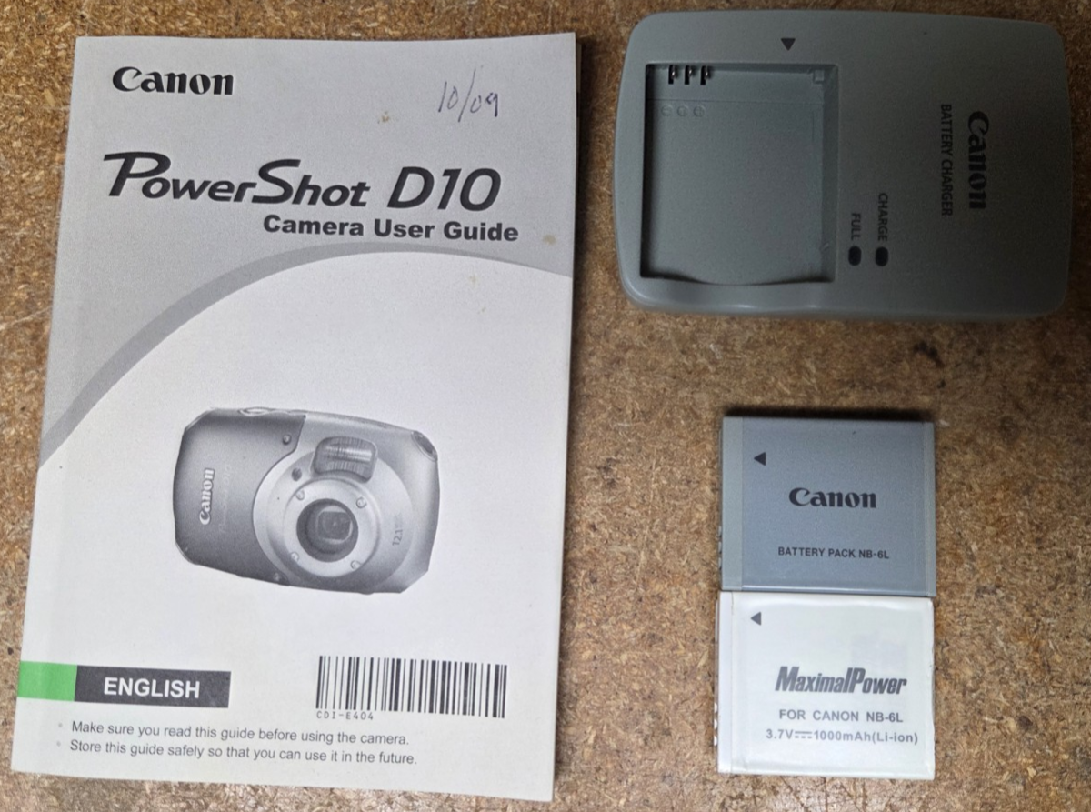 - Canon PowerShot D10 12.1MP Digital Camera - (Charger, Manual, Batteries)