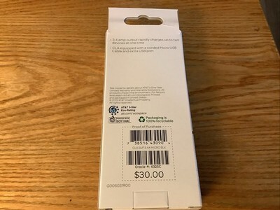 New AT T car charger Micro USB. Box states it can rapidly charge up to two devices at one time. Feel free to email with questions. I do combine shipping on multiple items. Have a great day!