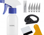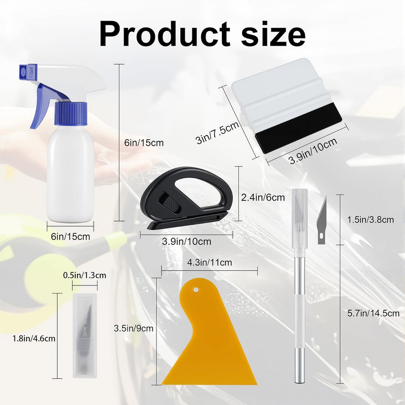 Window Tint Kit: Package included 5 pcs of window tint tools, a squeegee with a soft cloth, a yellow vinyl squeegee, a safe membrane cutter, a 100ml spray bottle, a craft knife and 5 spare sharp blades for replacement.