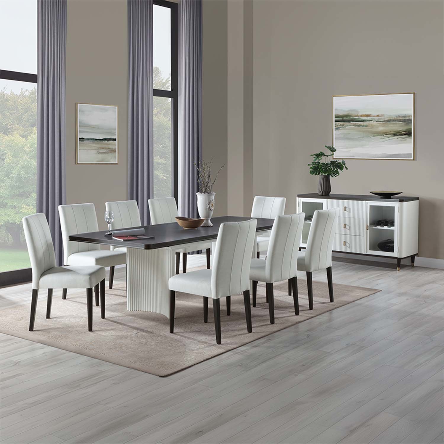 The Carena dining set exudes timeless elegance with its white and brown finish. The rectangular dining table features an extension top, perfect for hosting larger gatherings. Paired with stylish side chairs and a matching server, this set combines form and function beautifully. The server offers ample storage, making it both practical and sophisticated, ideal for enhancing any dining room ambiance.