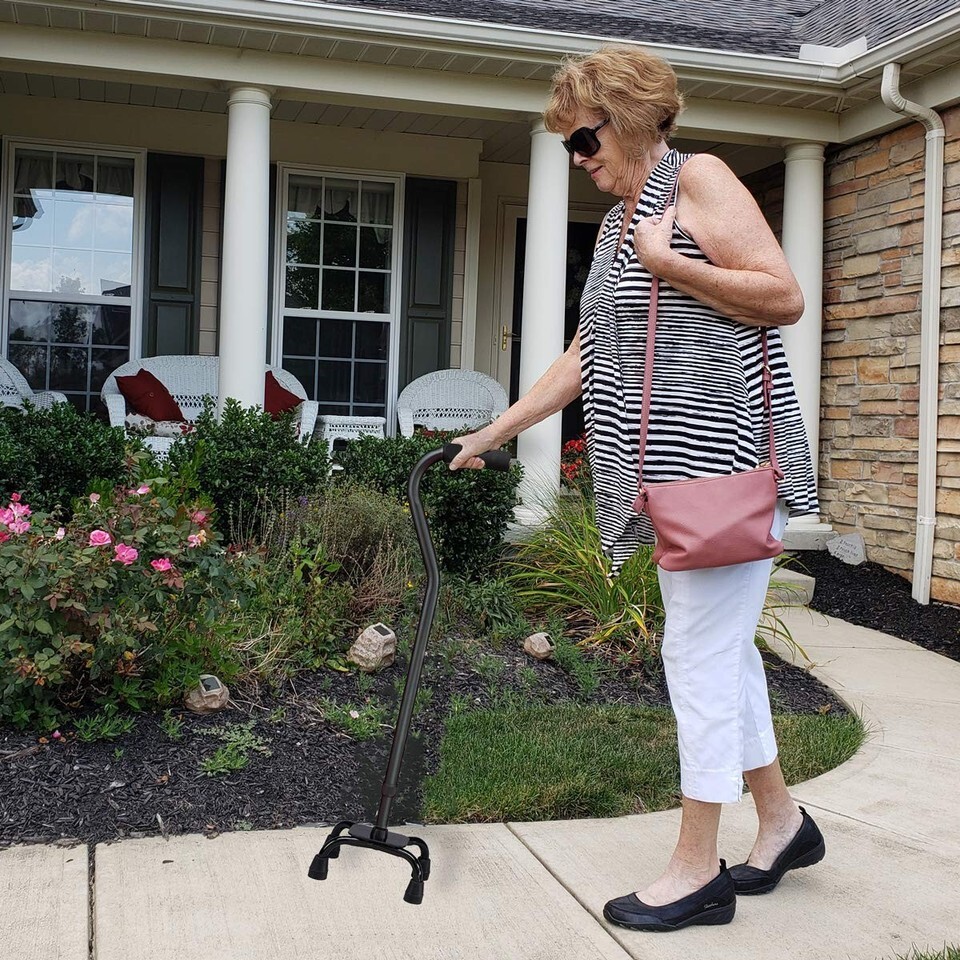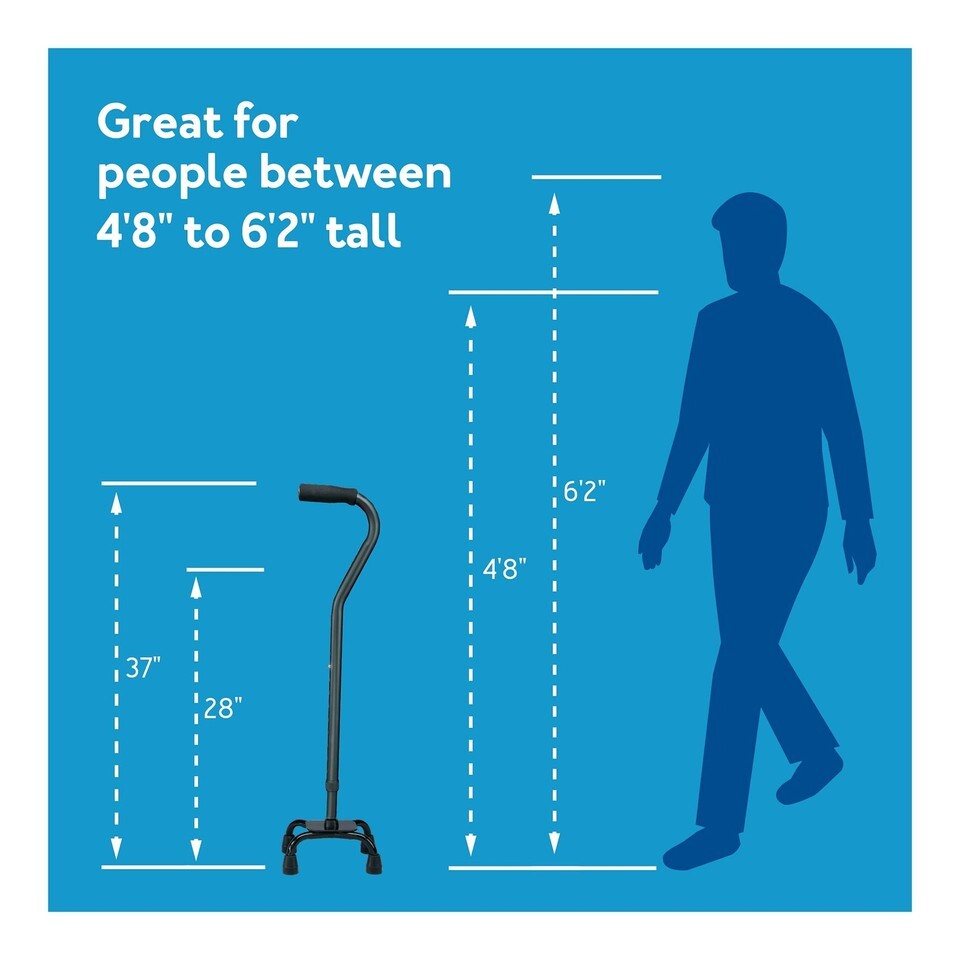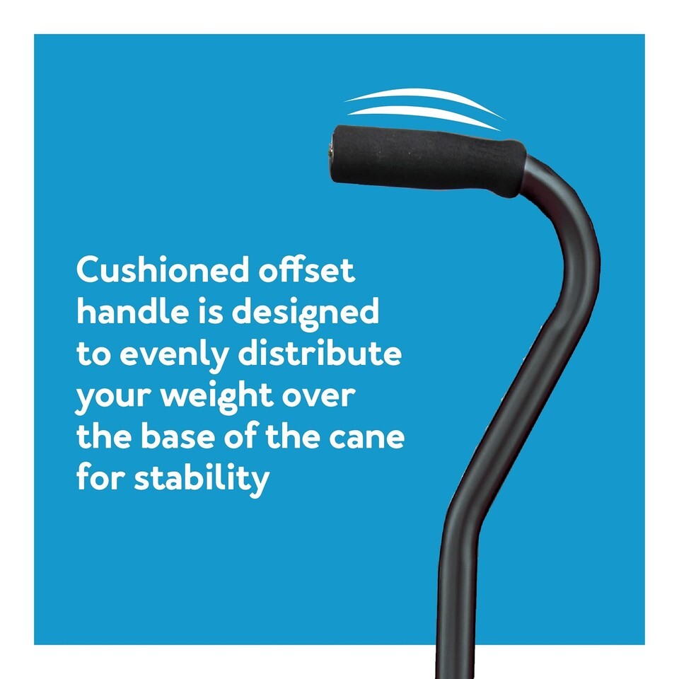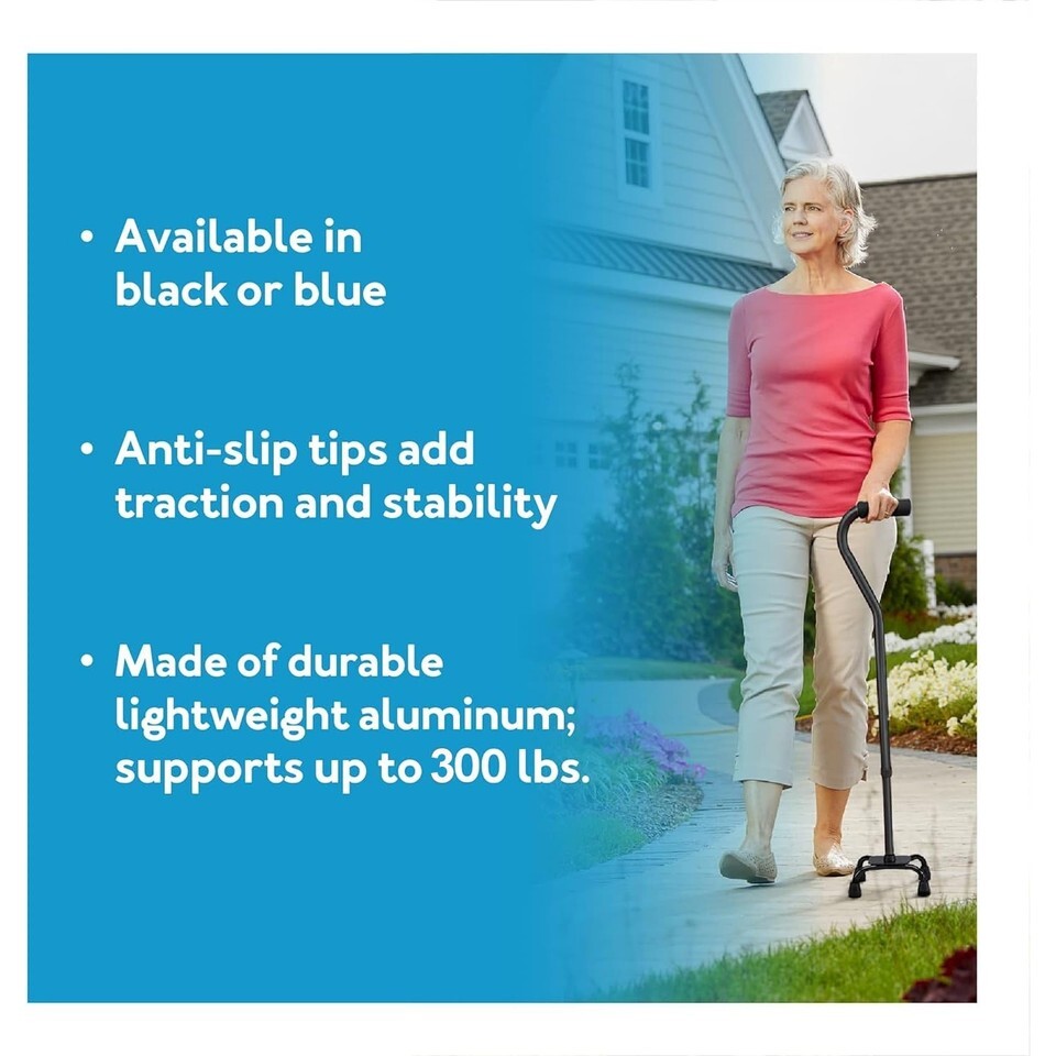 This comfortable cane features a cushioned handle that reduces pressure on the wrist and is adaptable for both left and right-hand users. The Designer Offset Quad Cane is ideal for people who are independent enough to utilize a one-hand walking aid but still prefer the stability of four contact points to the floor. Heavy-duty, lightweight, and agile. This walking cane's design is ideal for daily use. Its lightweight aluminum material means it's easy to use and can withstand heavy usage. Its small base allows users to move quickly without having to worry about the cane burdening their movements. Stylish and sleek. Designer canes are perfect for those looking for a sense of style in their mobility aid. Choose from two elegant colors, blue or black. Height adjustable. Having your cane at the right height is vital for proper support. This adjustable cane can be adjusted from 28" to 37" to meet the needs of the user. Will withstand heavy weights. Canes need to be able to uphold heavy weight. This quad cane with a small base can hold up to 300 lbs. making it a stable source of support. Its offset cane handle has been designed to stabilize and centralize the user's weight to reduce pressure on their wrist. Weight Capacity: 300 lbsHandle: Offset Height Adjustable: Yes Folding: No Wrist Strap: No Tip: Quad Package Weight: 2.9 lbs.Product Dims (h x w x d): 28" - 37" x 6" x 7.75" Package Dims (h x w x d): 28.5" x 7.6" x 6.13" Product Weight: 1.94 lbs. Instructions Heavy-duty, lightweight, and agile. This walking cane's design is ideal for daily use. Its lightweight aluminum material means it's easy to use and can withstand heavy usage. Its small base allows users to move quickly without having to worry about the cane burdening their movements. Stylish and sleek. Designer canes are perfect for those looking for a sense of style in their mobility aid. Choose from two elegant colors, blue or black. Height adjustable. Having your cane at the right height is vital for proper support. This adjustable cane can be adjusted from 28" to 37" to meet the needs of the user. Will withstand heavy weights. Canes need to be able to uphold heavy weight. This quad cane with a small base can hold up to 300 lbs. making it a stable source of support. Its offset cane handle has been designed to stabilize and centralize the user's weight to reduce pressure on their wrist.