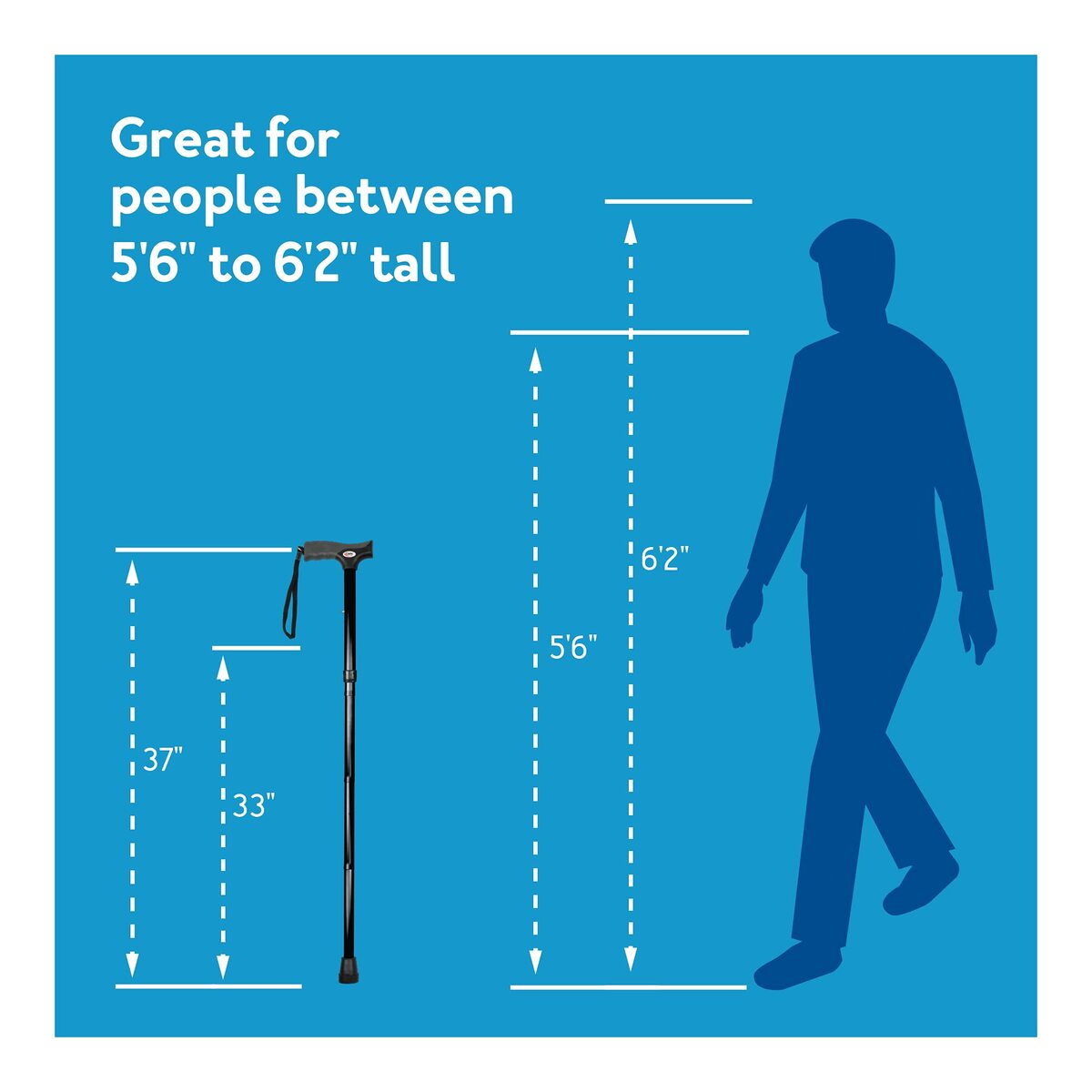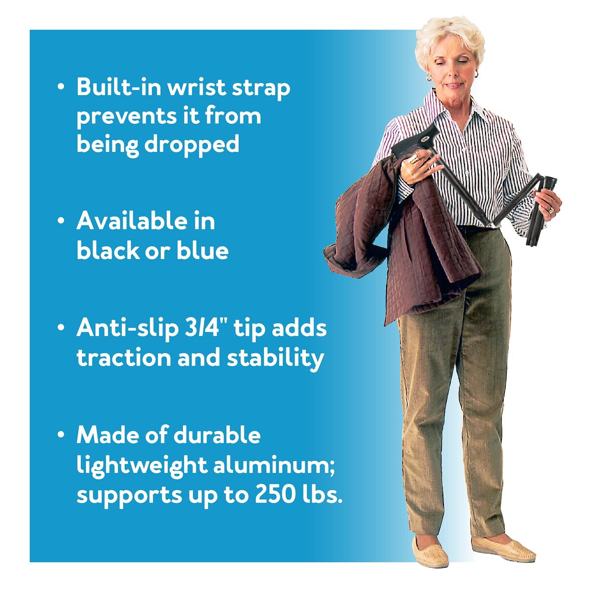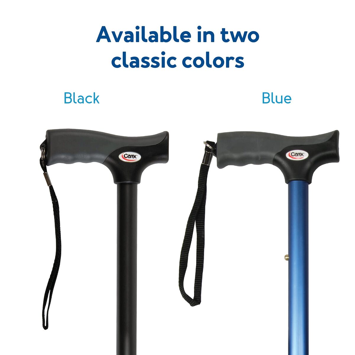 OVERVIEW TECHNICAL SPECIFICATION MANUAL/LINKS The Soft Grip Folding Cane provides the most comfortable grip on the market. This ergonomic cane's innovative technology reduces pressure and stress on the wrist and feels soft to the touch. The anti-slip feature makes it safe to use, and it folds easily for storage or travel. It comes with a convenient wrist strap. Foldable cane. The collapsible cane easily folds up for simple storage or to be used as a folding travel cane. Pull each cane component to fold up for storage. Designed for comfort and support. This mobility aid combines an offset handle with an ergonomic grip for maximum support and comfort. The ergonomic walking canes handle reduces the stress put on the wrist while centralizing the weight support. Made of lightweight and sturdy aluminum. The lightweight adjustable walking cane can support up to 250 lbs. and only weighs .7 lbs. The aluminum folding cane has been designed for anyone that may lack strength but relies daily on a mobility aid to get around. Height adjustable. The Carex folding walking cane features an adjustable height of 33" to 37" to accommodate users of various heights. Stylish and sleek. Choose from two elegant colors, blue or black. Weight Capacity: 250 lbs.Height Adjustable: YesWrist Strap: YesTip: 3/4"Product Weight: 0.7 lbs. Handle: Soft Grip DerbyFolding: Yes Package Dims (h x w x d): 14.5" x 7" x 1.75"Package Weight: 0.98 lbs.Product Dims (h x w x d): 33" - 37" x 5.06" x 1.5" Foldable cane. The collapsible cane easily folds up for simple storage or to be used as a folding travel cane. Pull each cane component to fold up for storage. Designed for comfort and support. This mobility aid combines an offset handle with an ergonomic grip for maximum support and comfort. The ergonomic walking canes handle reduces the stress put on the wrist while centralizing the weight support. Made of lightweight and sturdy aluminum. The lightweight adjustable walking cane can support up to 250 lbs. and only weighs .7 lbs. The aluminum folding cane has been designed for anyone that may lack strength but relies daily on a mobility aid to get around. Height adjustable. The Carex folding walking cane features an adjustable height of 33" to 37" to accommodate users of various heights. Stylish and sleek. Choose from two elegant colors, blue or black.