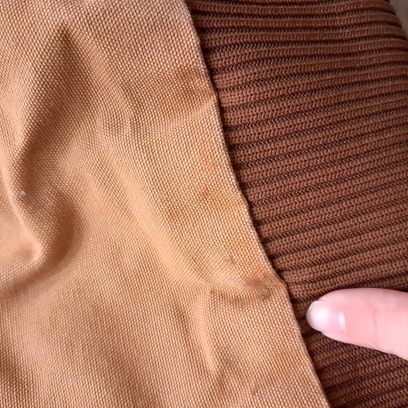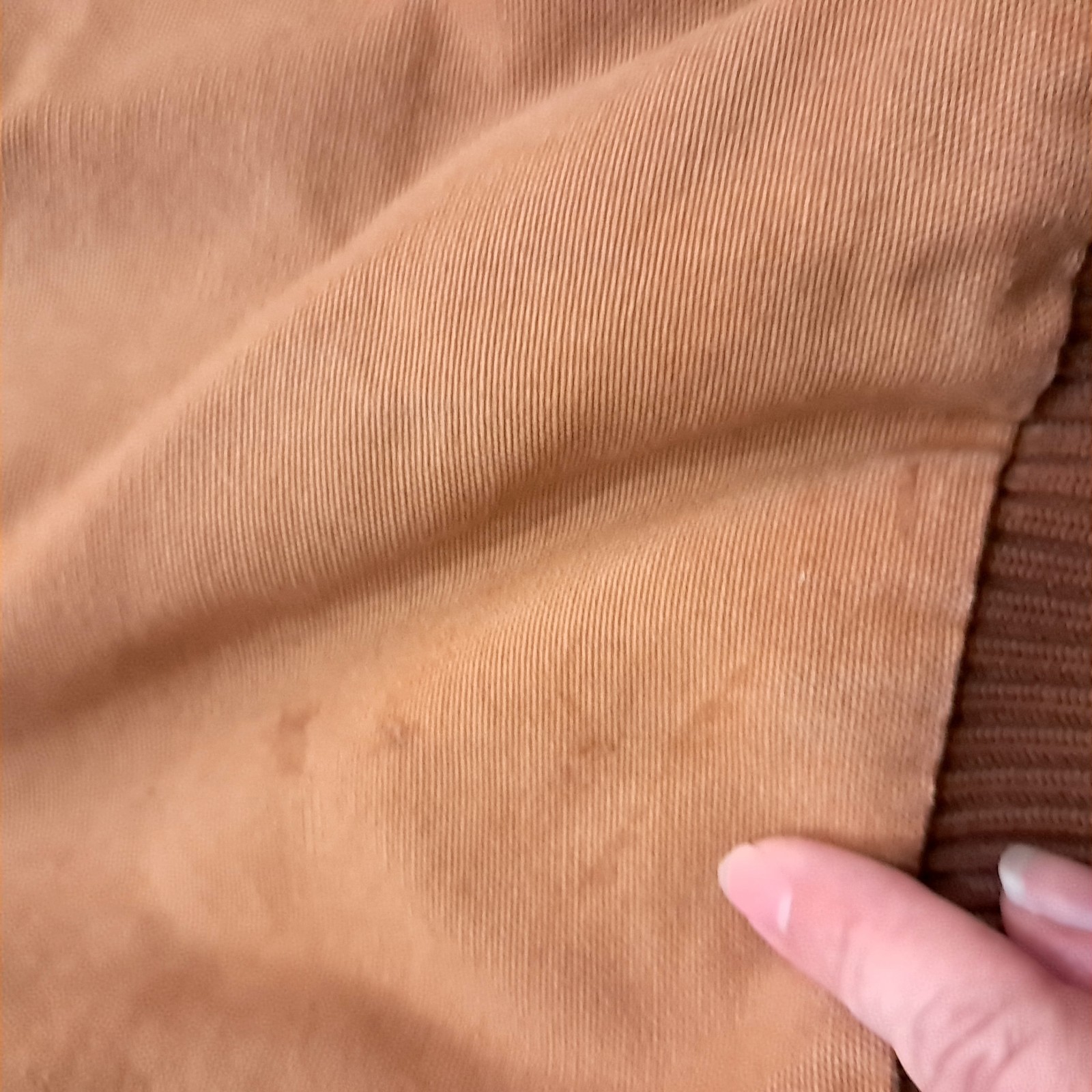 Heavy weight jacket. Camel brown duck with quilted flannel lining. Some cosmetic wear/marks as shown and some fading around the seams. Hooded/hoodie style with drawstring. No holes or tears. Made in the USA.