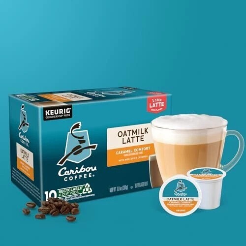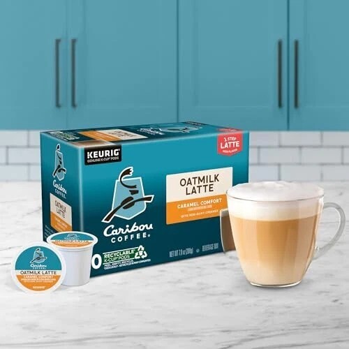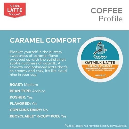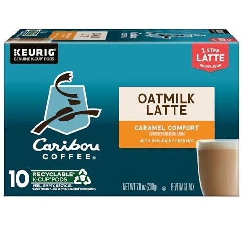 A wonderfully smooth and creamy alternative to traditional dairy lattes, with the added taste of oatmilk to make the caramel flavor soar, Caribou Coffee Caramel Comfort Oatmilk Latte K Cup pods are as easy to brew as they are to enjoy. And they?re compatible with all Keurig single serve coffee makers. It?s your coffeehouse favorite. Made for your house. When your latte is this good, there?s no such thing as too close for comfort. Enjoy Caramel Comfort Oatmilk Latte and blanket yourself in the buttery sweetness of caramel flavor wrapped up with the satisfyingly subtle taste of oatmilk. It?s a smooth and balanced latte that?s so creamy and cozy, it?s like cloud nine in your cup. One Step Oatmilk Lattes from Caribou Coffee are easy to brew and made for you. Filled with coffee, flavoring, and non-dairy creamer, every Caramel Comfort One Step Oatmilk Latte K Cup pod has everything you want in an exceptionally made latte. So you can enjoy the distinctive flavor, subtle sweetness, and creamy taste you love at the push of a button. Caribou Coffee Caramel Comfort One Step Latte K-Cup pods. Simple. Delicious. And recyclable.* Enjoy the same great-tasting coffee you know and love, and when you?re done, just peel, empty, and recycle. *Check locally, not recycled in many communities.