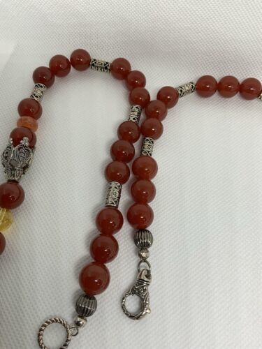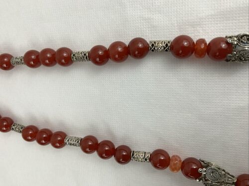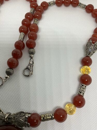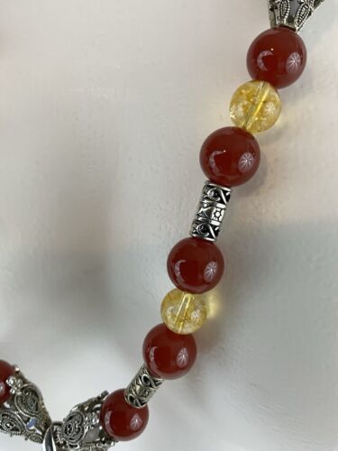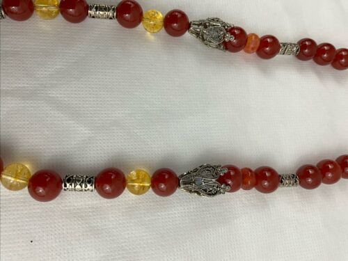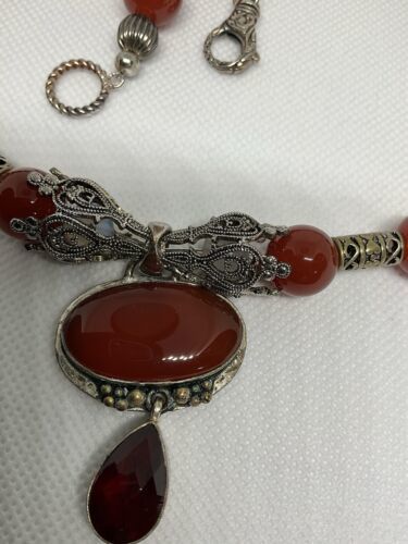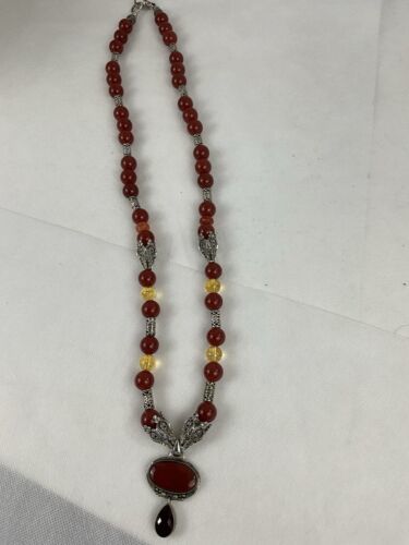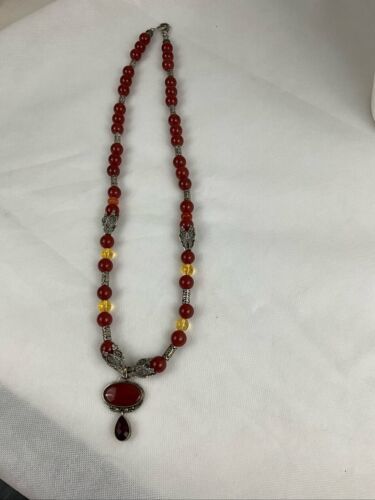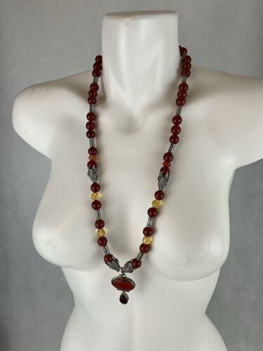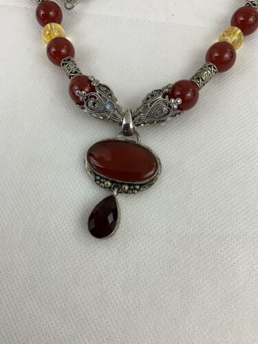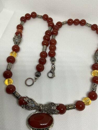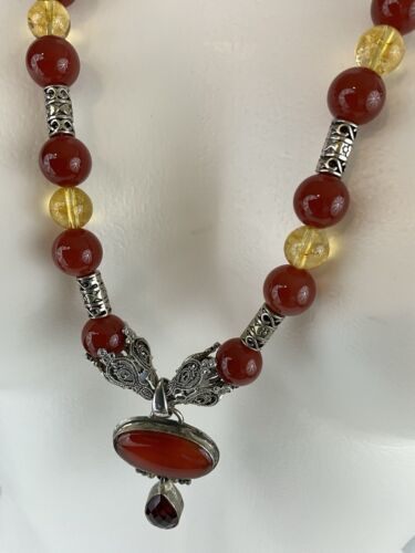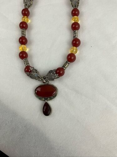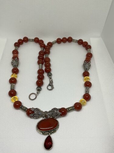 Crafted with authentic, natural carnelian stones, one of a kind piece with clean citrine to provide separation and contrast. A glass ruby pear shaped teardrop, hangs from main cabachon. The bezel is Bali style, sterling silver. The four bell shaped silver beads separating each section are stainless steele. Carnelian is one of the first gemstones to be used in jewelry, highly valued most notably by the aristocratic women of the Roman Empire. This necklace is reminiscent of Tibet and is 28? in length. All beads are authenticated by use of the Prestige II Gem Tester, the best professional instrument in the business.