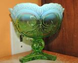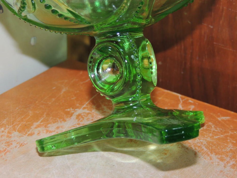 - Carnival Glass Compote 6" Green Opalescent bead Fluer de Lis Button Ruffled Edge
