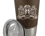 Bring your drink and your Irish pride with you wherever you go with this beautiful travel mug. We expertly laser your very own authentic Irish coat of arms and surname into a rustic brown leather to reveal a metallic gold design. With each mug's metal insulation, your beverage will stay cooler or hotter longer. Comes with a removable lid with drinking hatch. Over 1000 available Irish coat of arms names.