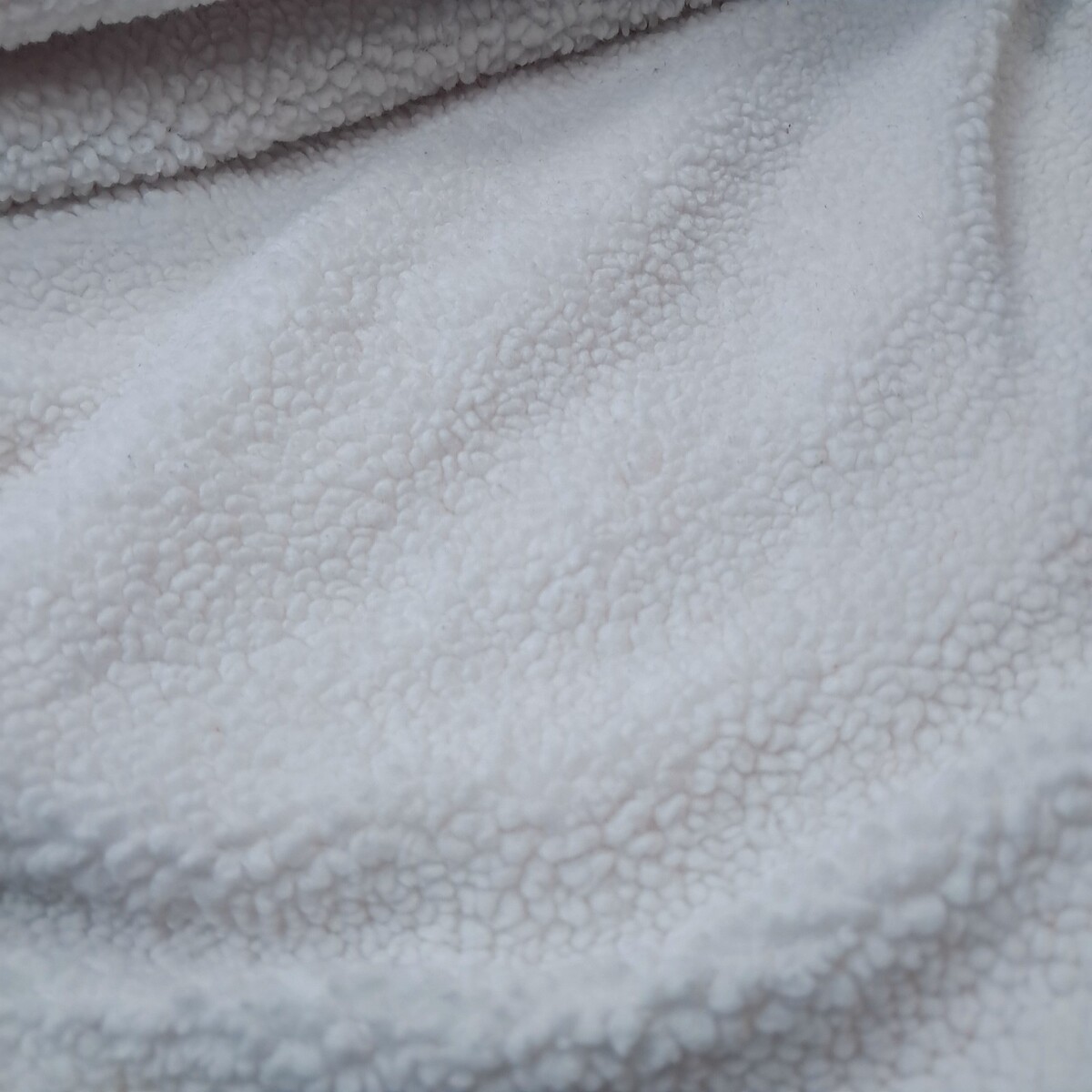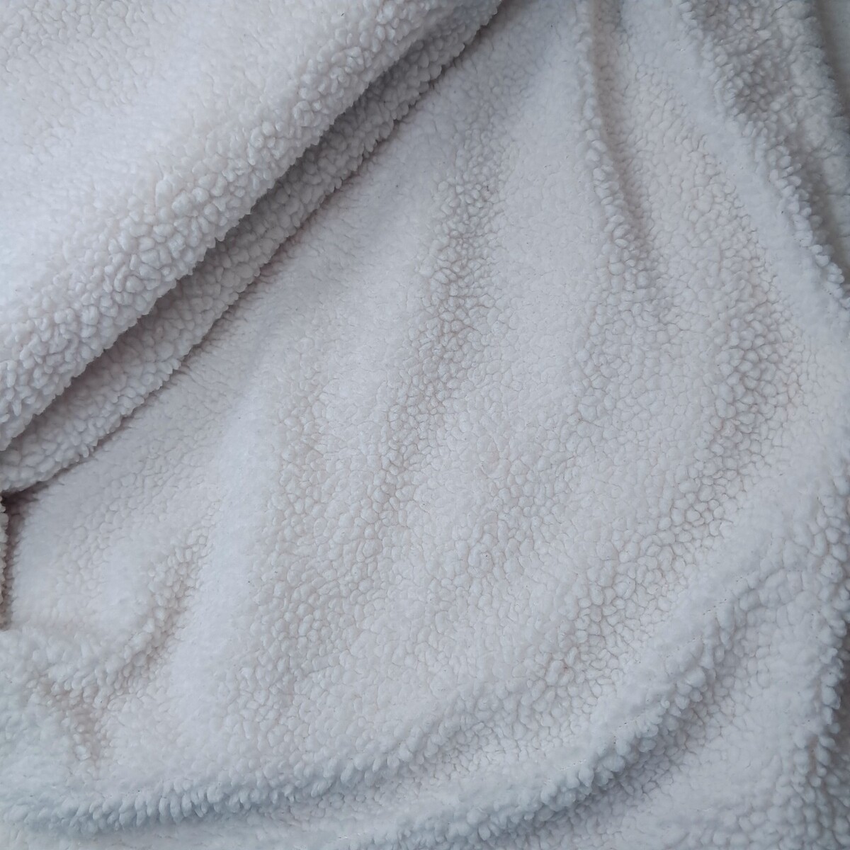 Soft plush type fabric on one side and white sherpa on the other. Very good condition. Thicker blanket.