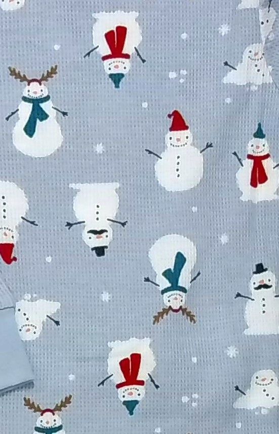 This delightful pajama set is perfect for keeping warm during the winter season. Featuring an adorable snowman print accented with scattered snowflakes, it adds a whimsical touch to bedtime. The set includes a thermal waffle texture that enhances comfort, and the rib-knit collar trim and cuffs ensure a snug fit.
