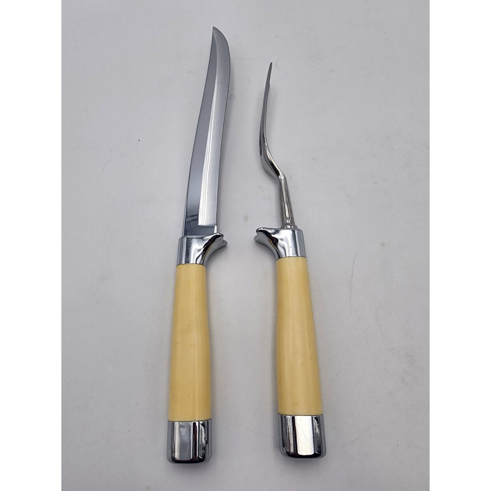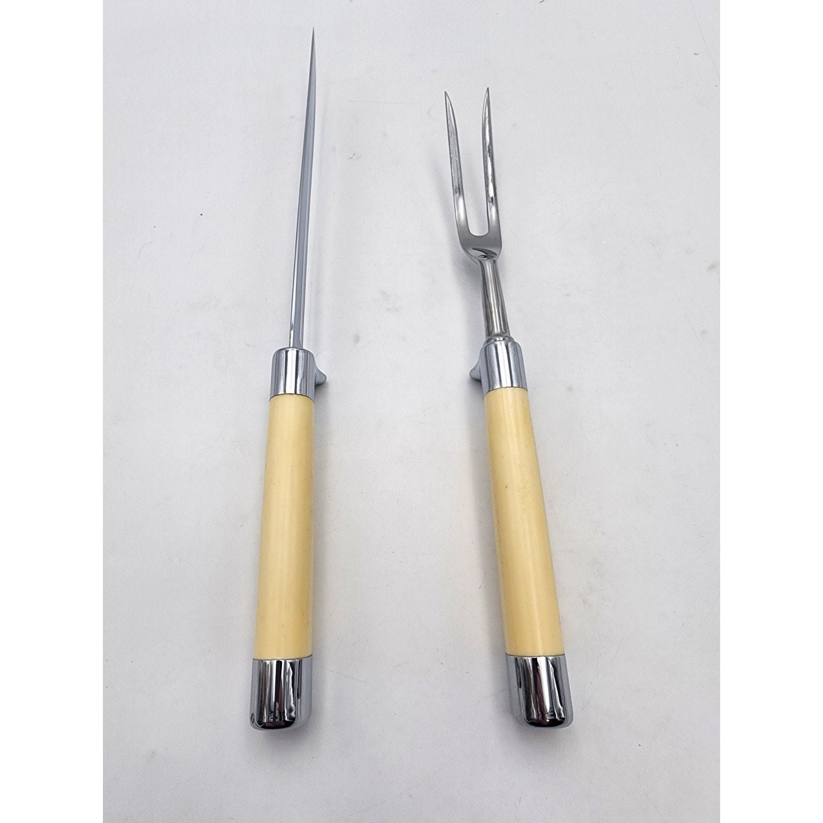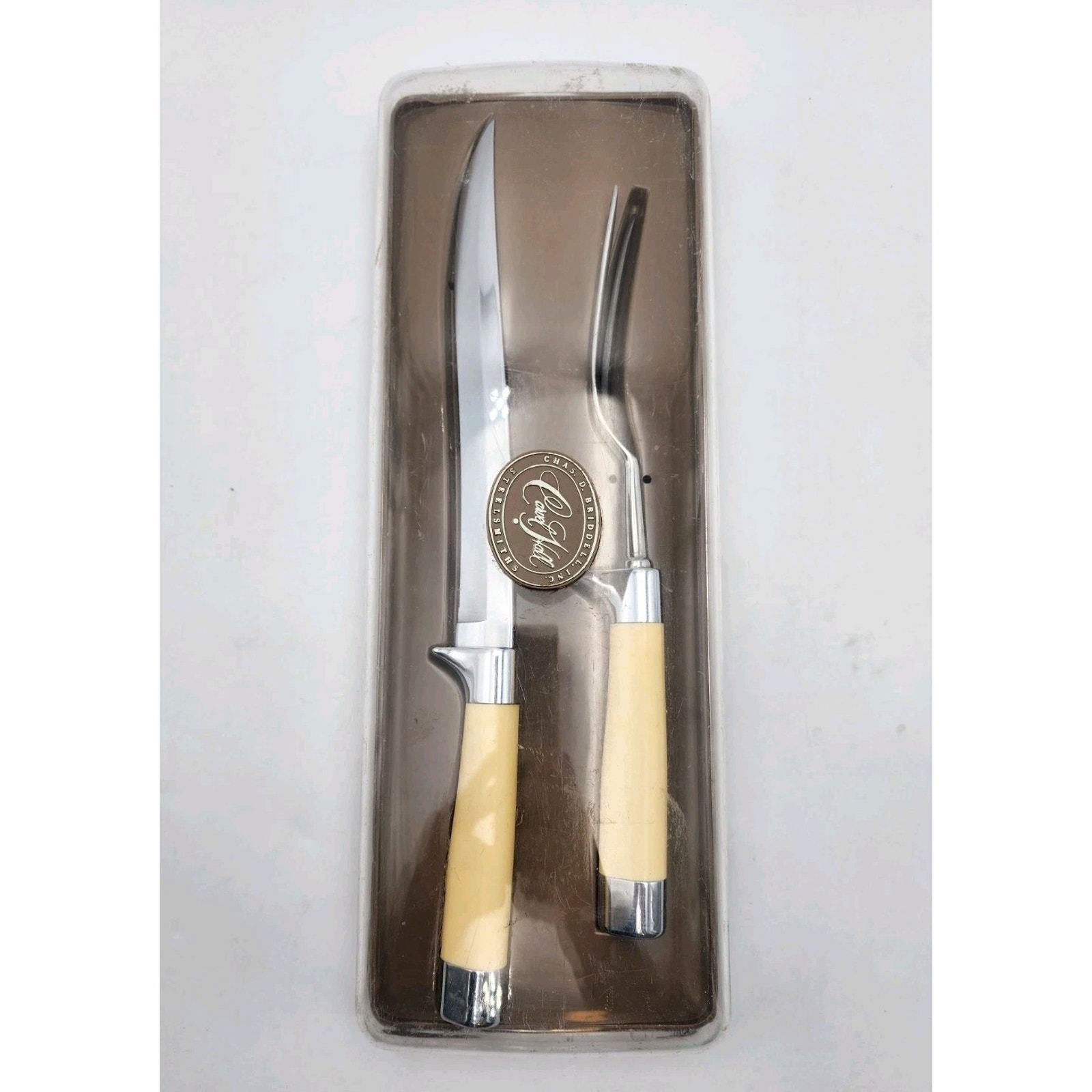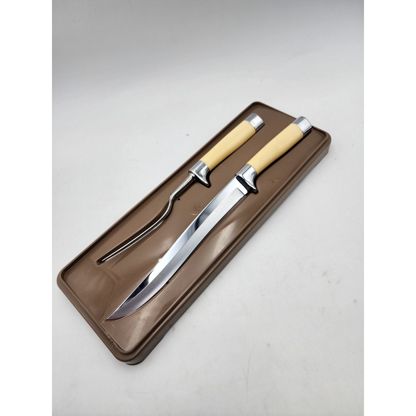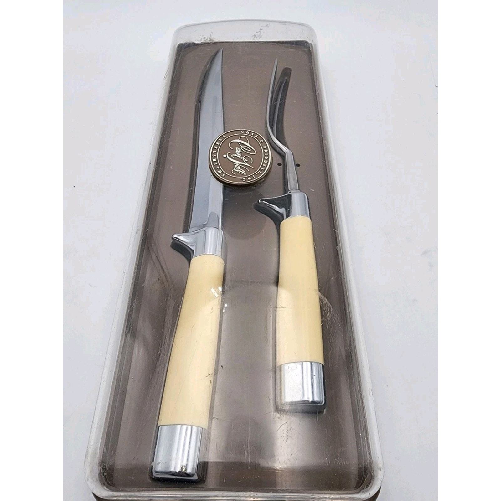 The Carvel Hall Fine Cutlery Set by Briddell includes a carving knife and fork, both made of stainless steel and measuring 13 inches in length. This original set comes in its original case and is designed for adult use. The Carvel Hall brand is known for its quality cutlery, making this set a desirable addition to any kitchen or collection. Ships Fast!