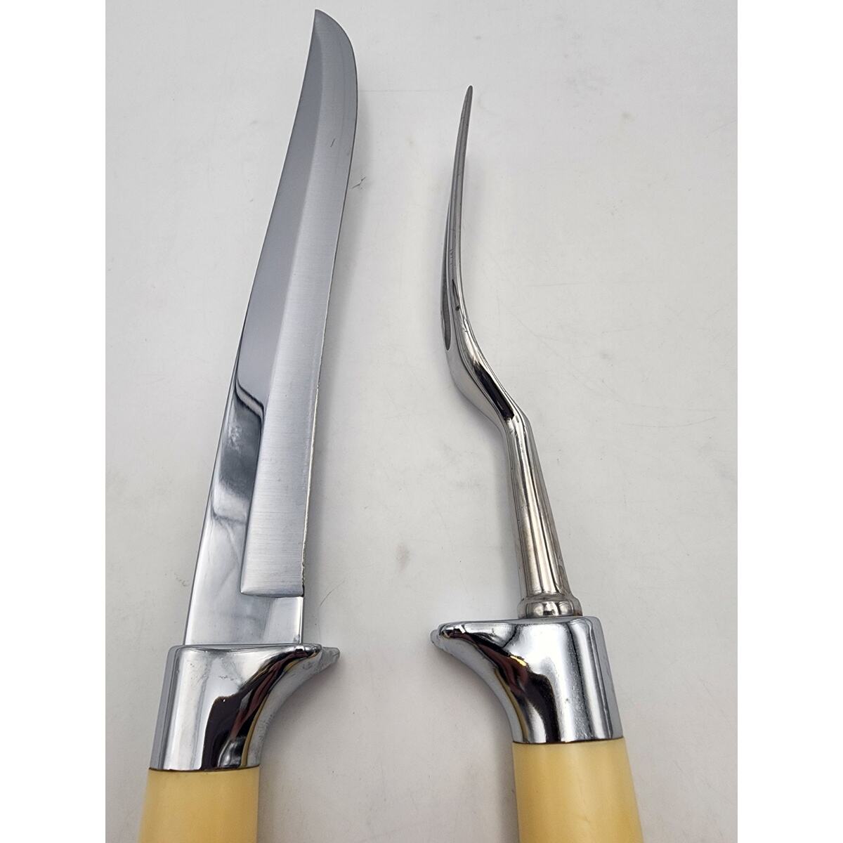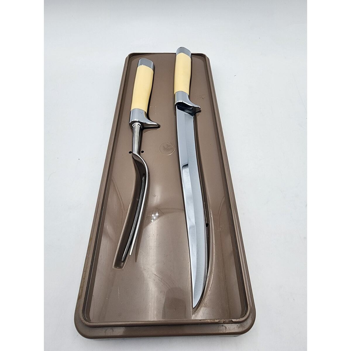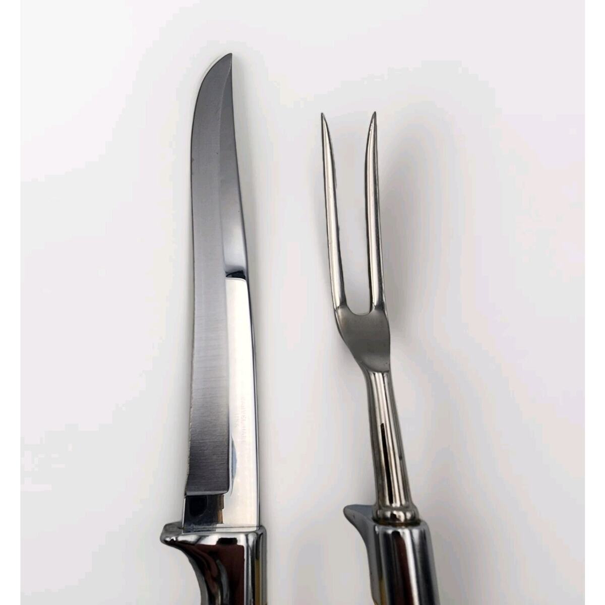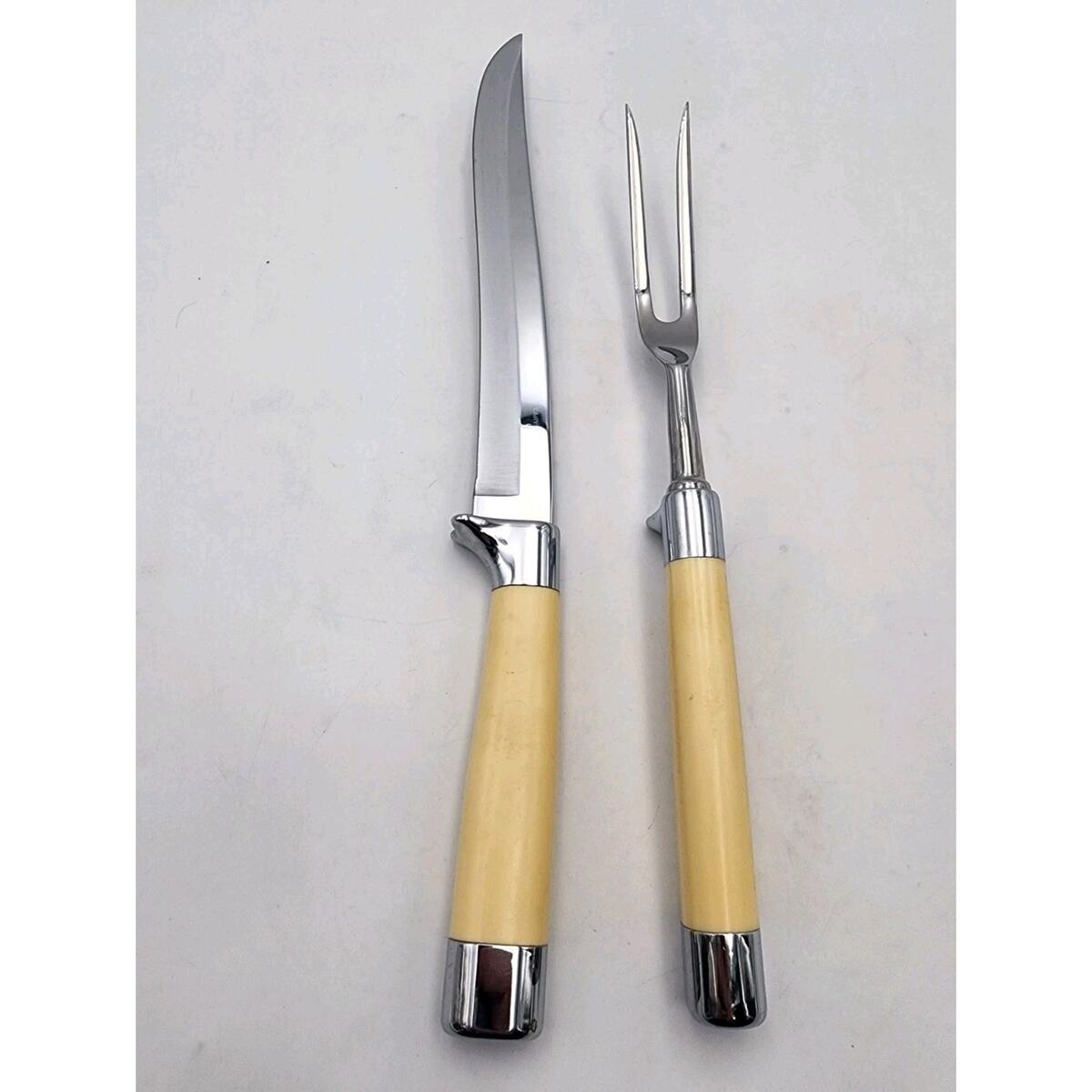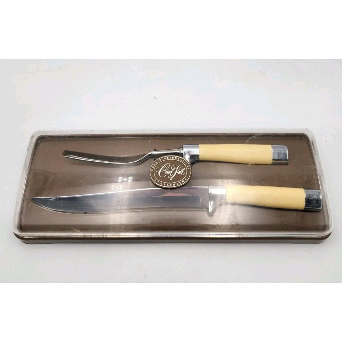 The Carvel Hall Fine Cutlery Set by Briddell includes a carving knife and fork, both made of stainless steel and measuring 13 inches in length. This original set comes in its original case and is designed for adult use. The Carvel Hall brand is known for its quality cutlery, making this set a desirable addition to any kitchen or collection. Ships Fast!