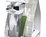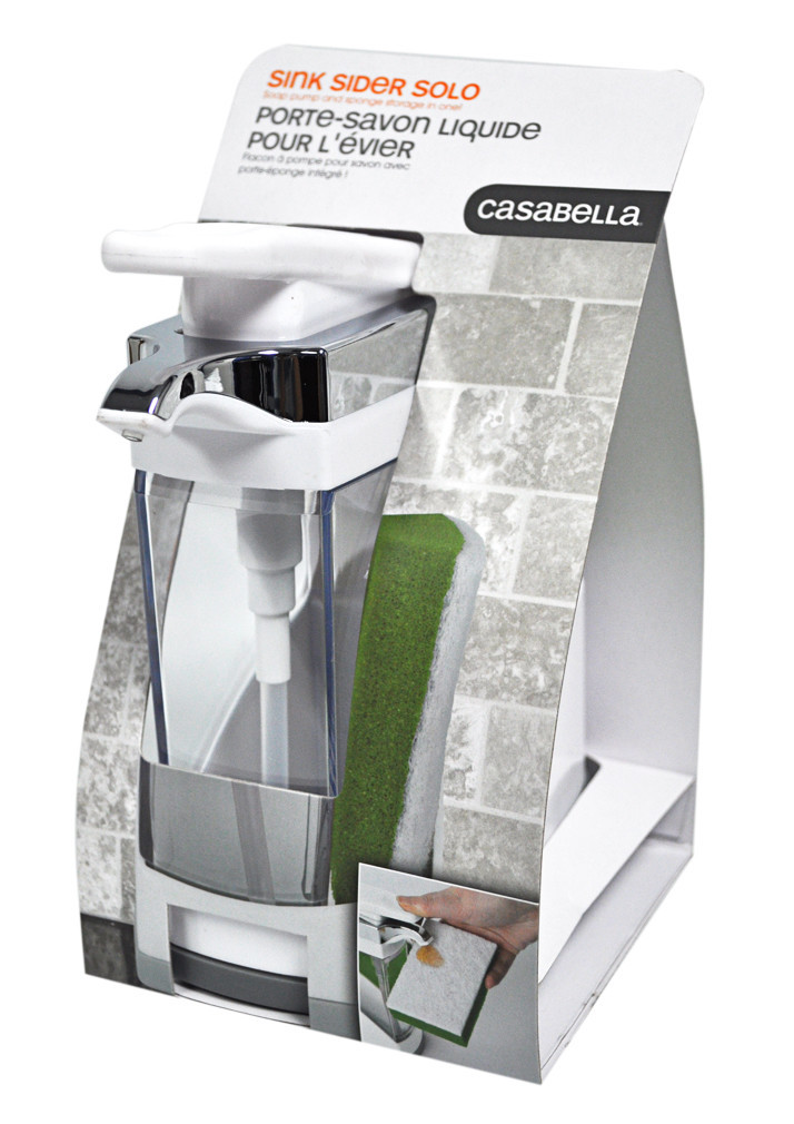 Casabella Sink Sider Solo White Chrome Soap pump and sponge storage in one. Pull tab up to open bottle to refill soap. Base comes off for cleaning. Single hand action. For dish soap and hand soap. Easy to refill. 14.5 fl. oz. capacity. Built in compartment for sponge or brush. One Sponge included. Manufacturer Part Number: 8550086 CB-50086