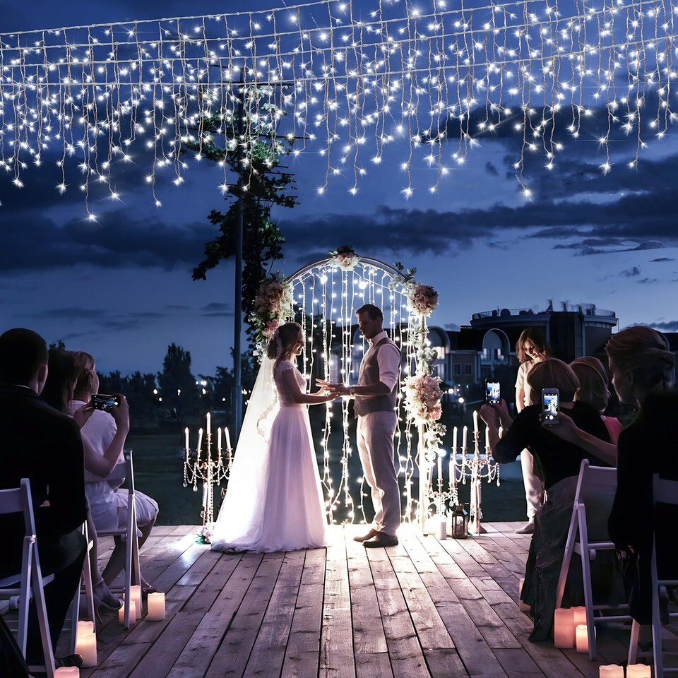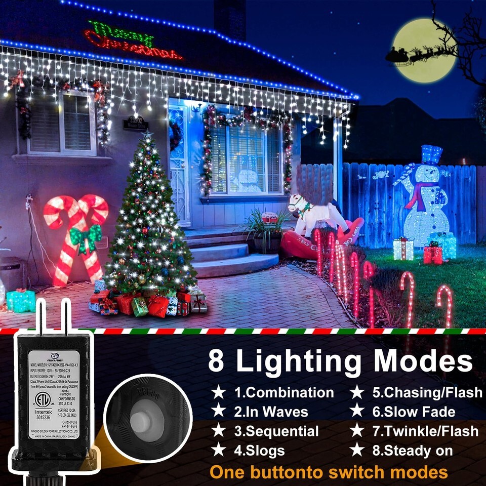 Luces de Navidad blancas frías: la cadena de 49 pies cuenta con 480 LED con 90 gotas, con un cable de enchufe de 9.84 pies para una facil configuracion. Disfruta de 8 modos de iluminacion, ademas de funciones de temporizador y memoria. Ideal para crear un ambiente acogedor para reuniones de Navidad