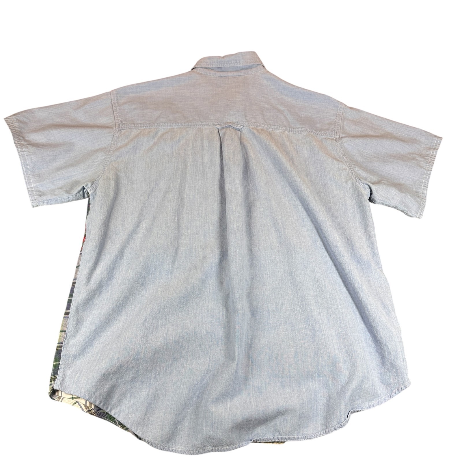 Features a unique patchwork plaid design in red, green, blue, and white with light blue chambray accents on the collar, yoke, and sleeves.