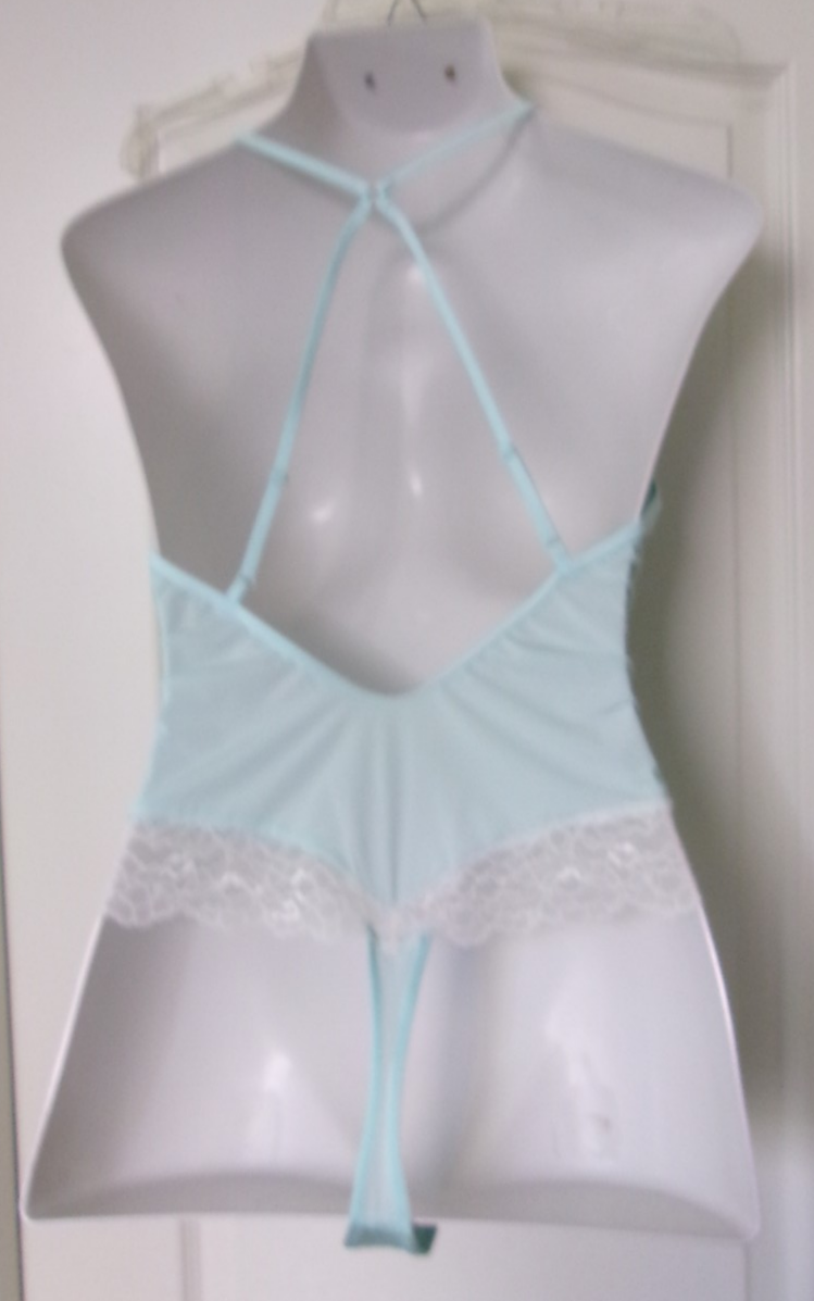 - Cassandra body suit Baby Blue size Large thong back with snaps at the crotch