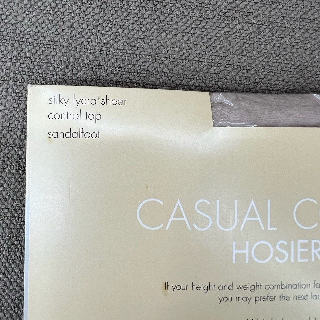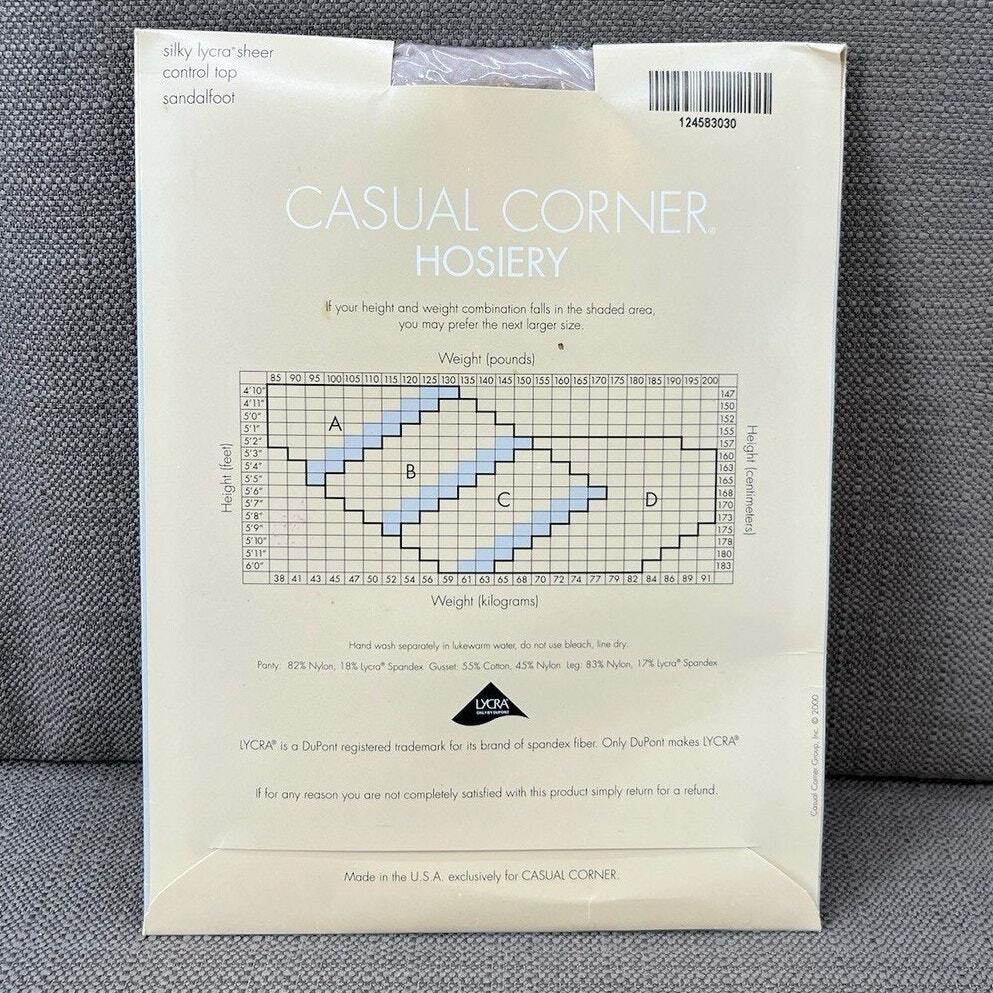 New in package Casual Corner Hosiery. Style #59612 in elegant Champagne color, Size B. Features a control top panty for shaping, sandalfoot design for open-toe wear, and silky Lycra sheer finish for a smooth, polished look. Packaging shows minimal wear but item remains sealed and unused.