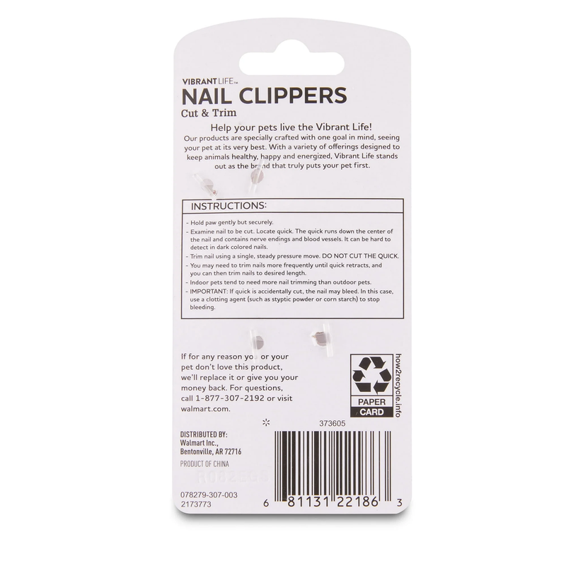 Make trimming up your pet's nails an easier task for all involved with our Vibrant Life Cat Nail Clippers. The stainless-steel cutting edges and blade notches help keep the nail in place during clipping, and the ergonomic handle is easy to control. To use, hold one paw gently and securely, insert a nail between the clipper blades, and cut off only a small part of the nail. Be sure to locate and avoid the quick first, which runs down the center of the nail, and trim the very end of the nail in a single move, with steady pressure, without cutting into the quick. Providing your pet with the means to have healthy nails is easy to do with our Vibrant Life Nail Clippers.