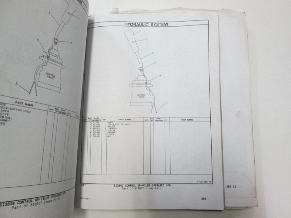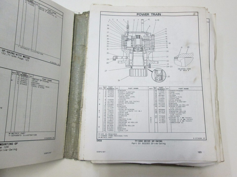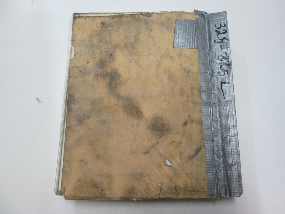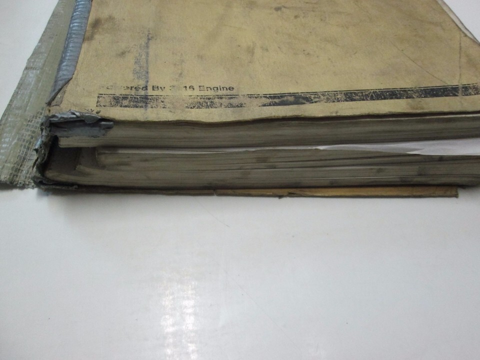 Parts manual is severely damaged with duct tape holding the pages together. There are loose pages within and pages may be missing. The front back cover are stained and worn, but over all the contents within are in legible condition.