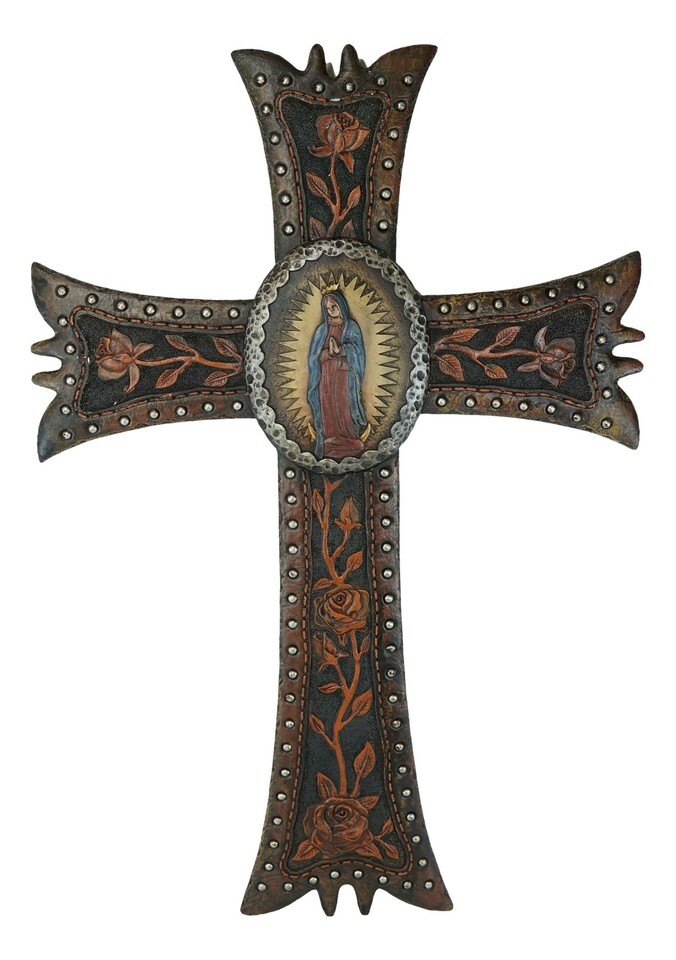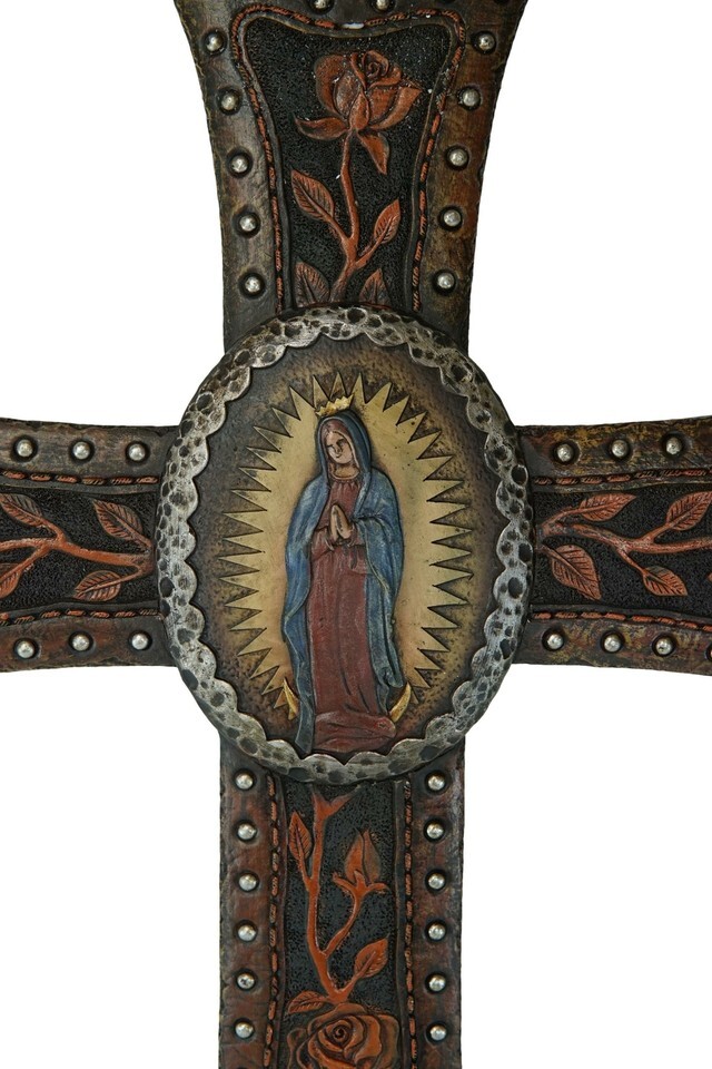 ? This wall cross is hand painted to look like leather and features a medal of Our Lady of Guadalupe at the center. Floral Rose Scroll patterns are etched to the beams of the cross to add artistic value to the cross.