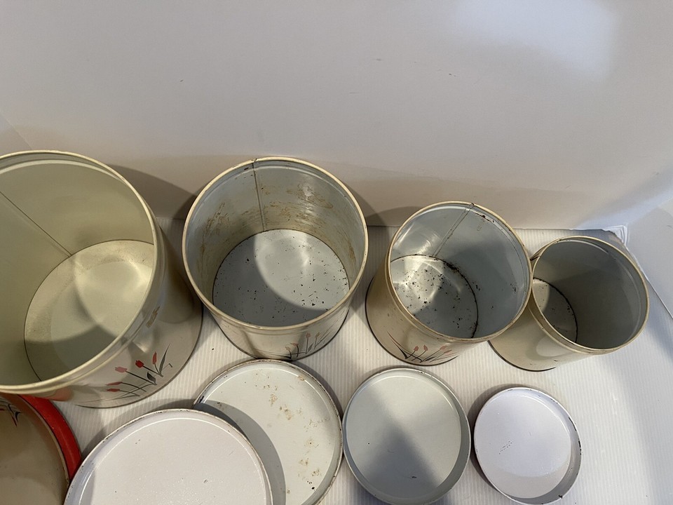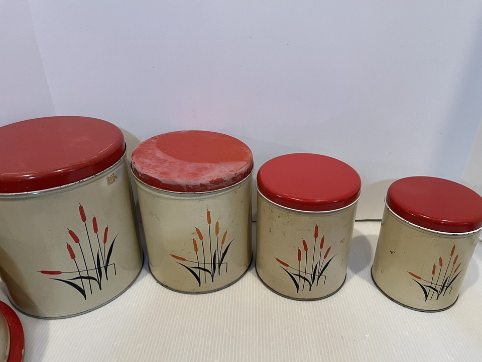 metal canister 11pc set; this is the classic, authentic cattails design of the '50s, full set of four canisters, largest is 7 inches diameter, smallest is 4 inches diameter, set of 4 nests inside. They have been used, show signs of rust on the