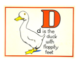 The letter D features a yellow billed duck with yellow feet and the words "d is the duck with floppity feet"