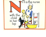 The letter N illustration features a nurse holding a baby with a basin and towels nearby and the words "n is the nurse with the child in her lap"