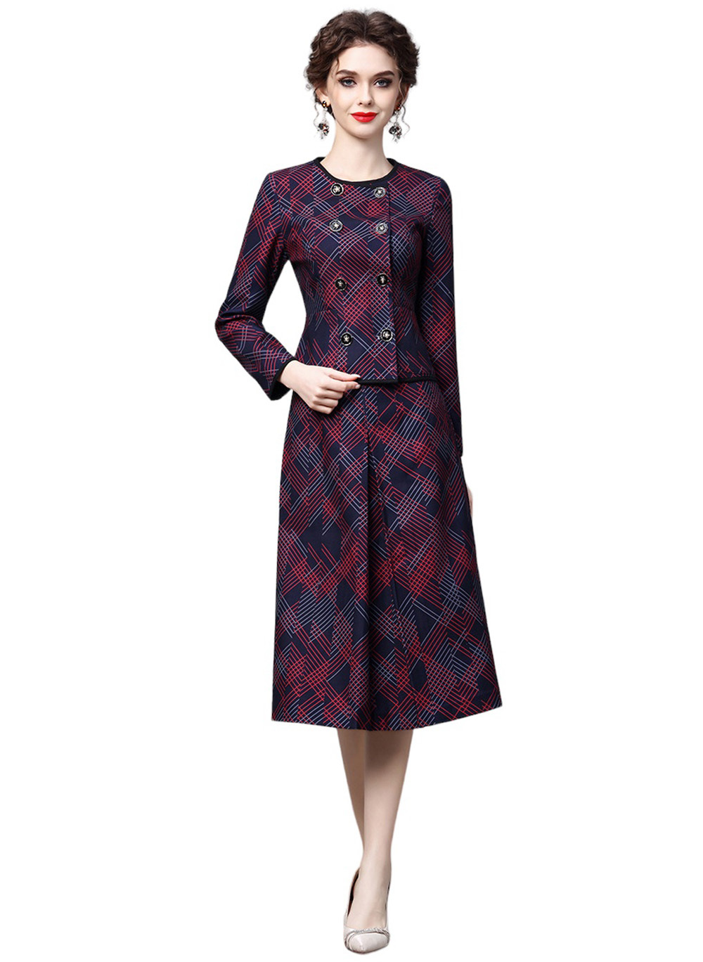 To channel the stylish essence of Amal Clooney's impeccable fashion without straining your budget, we present our budget-friendly version of this ensemble. The collarless jacket features a round neck and a double-breasted design, exquisitely adorned with delicate floral buttons. Black piping details around the neck and cuffs add a refined touch. The accompanying A-line skirt boasts a high-rise waist and a flattering midi-length, ensuring both comfort and style. Whether for professional settings or other occasions that demand sophistication, this ensemble allows you to radiate confidence and elegance.