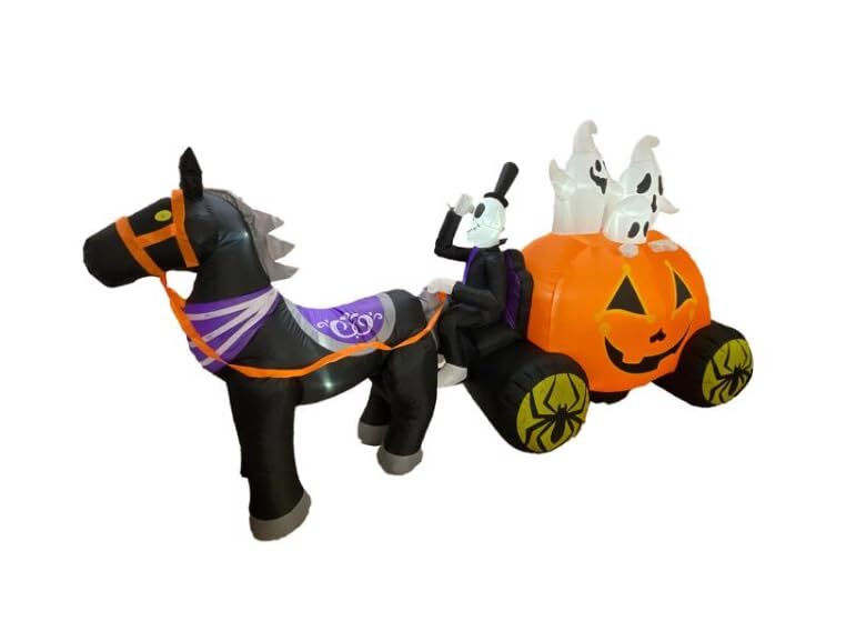 Product description: This 10ft long, inflatable, horse-drawn pumpkin carriage is made to wow all of your guests. This inflatable features ghost passengers and a skeleton conductor ready to bring the spookiness of Halloween to you. Easy set-up, self inflates in seconds Lights up Collapses for off-season storage