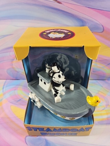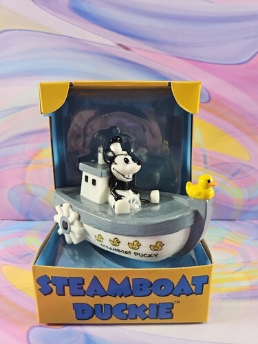 This is a collectible Steamboat Willie-inspired "Steamboat Duckie" rubber duck by Celebriducks. New and unremoved from display box - it's a great piece of unique classic cartoon merchandise for a big fan.