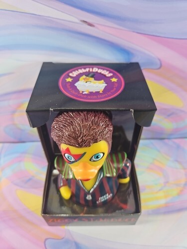 Collectible David Bowie-inspired "Ziggy Starduck" rubber duck by Celebriducks. ("Ziggy Stardust") New in display box.
