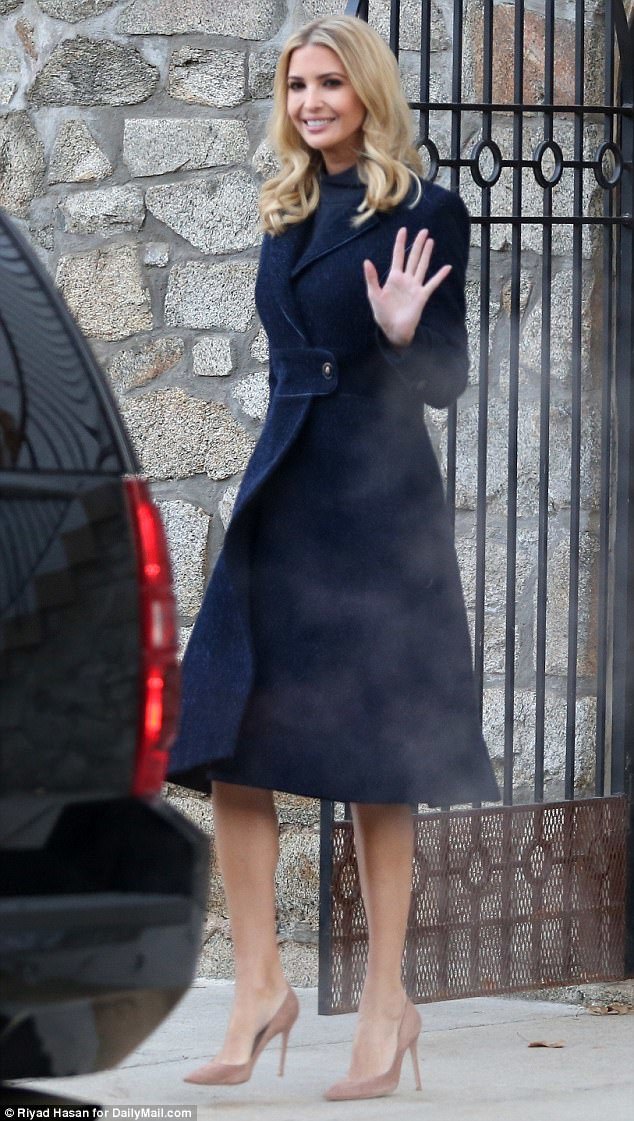 Ivanka Trump opted for a $4990 navy coat, a garment she has frequently worn in the past, cementing its place as one of her favorite pieces. The coat features a notch collar, a button-clasp waist belt, and a flared skirt.