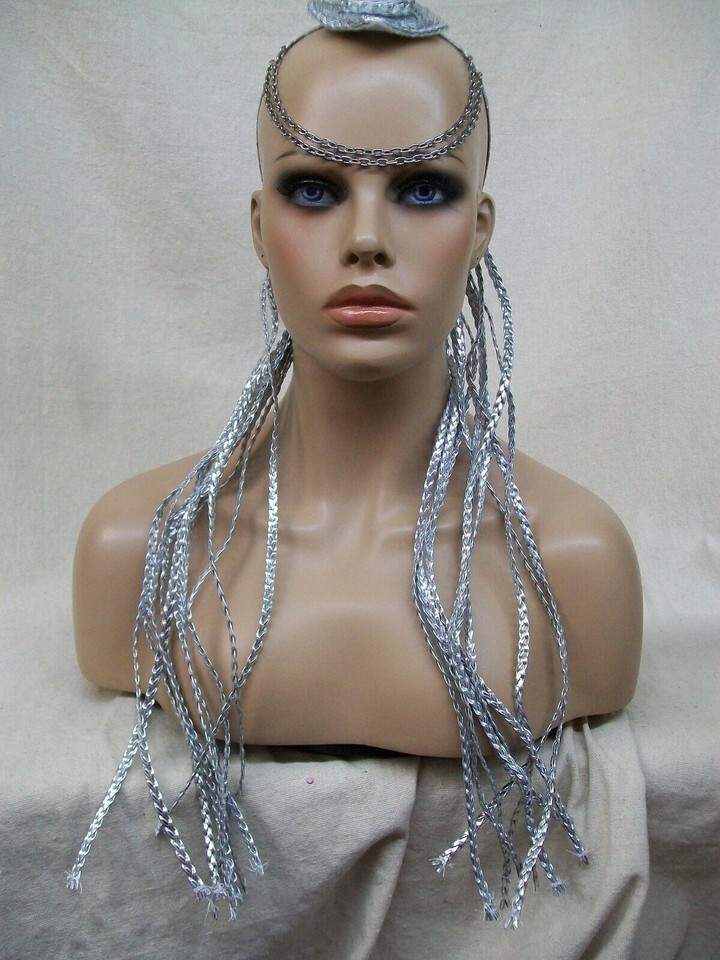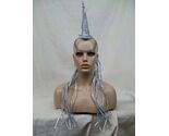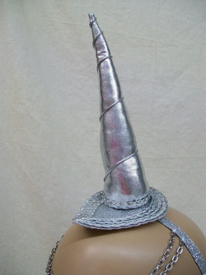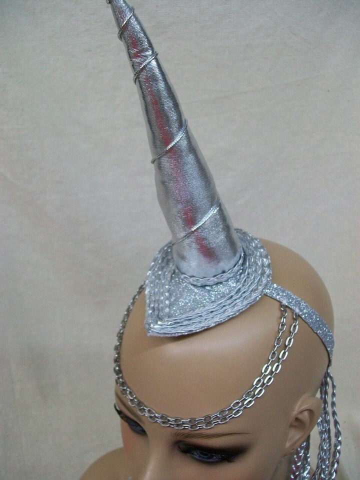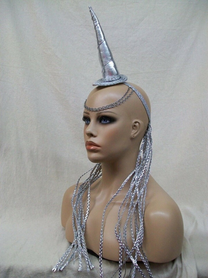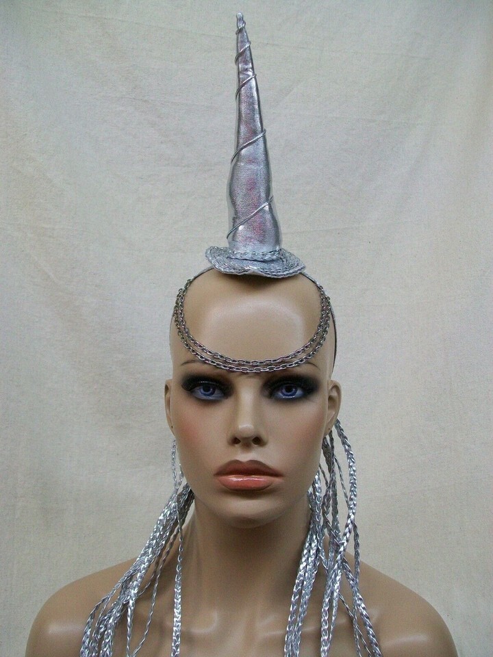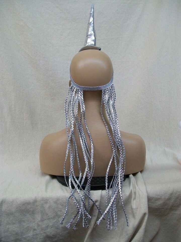 Unicorn Costume Horn Headband with attached chains and silver braids for mane. Horn is stuffed with fiberfill and may need some shaping. Horn has attached silver glittery elastic attached with Silver braids sewn on sides. Braids have waves in them from being folded in package. Headband is stiff and may wear tight. Elastic don't bounce back real good after being stretched. Don't over stretch or it may become loose to wear. Edges of horn base wants to curl up. Colored fuzz trapped in the thread on underneath. Loose thread on braid ends. Please see all photos. SOLD AS IS. Braids can be worn pulled toward the front or back. Can be worn by male or female. Adult: One Size Fits Most. Horn is Approx. 7.5" tall from base.