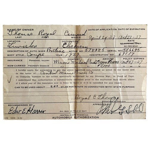 - Central Maine Power 1937 Automobile Authorization Certificate Pontiac DWAA10
