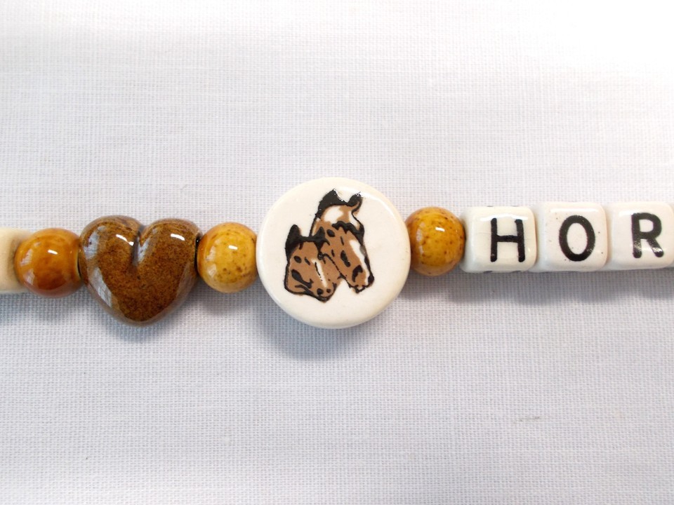 It is made of PERUVIAN CERAMIC HIGH FIRE BEADS - I - HEART SHAPE (BROWN) LOVE - HORSES BROWN MOTHER AND BABY ROUND DISC AND H O R S E S TEXT BEADS AND ROUND RUSTIC COLOR ACCENTS
