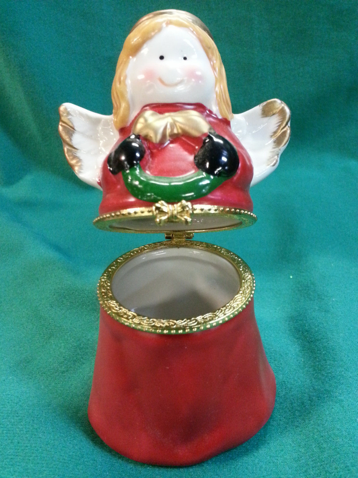 - CERAMIC HANDPAINTED ANGEL HOLDING WREATH TRINKET BOX CHRISTMAS DECORATION