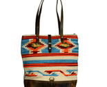 Challenger women's handbag made from upcycled canvas and full-grain leather accents. Shoulder bag is uniquely accented with a multicolored aztec design. This practical, lightweight, and conveniently sized roomy bag is made sturdy to endure everyday use. Perfect choice for school, work, travel, or weekend trips. Main compartment has a full zipper closure with a wide opening to easily access your belongings. The fully lined interior also features a side zippered pocket, and two open pockets for additional storage. The backside also has a zippered pocket to store easily reachable items. The antique finish brass hardware beautifully ties the bag together. Bag measures 16" L x 15" H providing plenty of room for all of your everyday essentials.