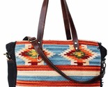Challenger women's handbag made from upcycled canvas, and full-grain brown leather straps. Shoulder bag comes beatifully accented with a blue and orange aztec design. Tote includes a removable shoulder strap. This practical, lightweight, and conveniently sized roomy bag is made sturdy to endure everyday use. Perfect choice for school, work, travel, and weekend trips. Main compartment has a full zipper closure with a wide opening to easily access your belongings. The fully lined interior also features a side zippered pocket, and two open pockets for additional storage. The backside also has a zippered pocket to store easily reachable items. The antique finish brass hardware nicely ties the bag together. Bag measures 16" L x 12" H providing plenty of room for all of your everyday essentials.