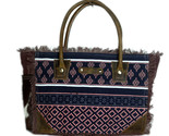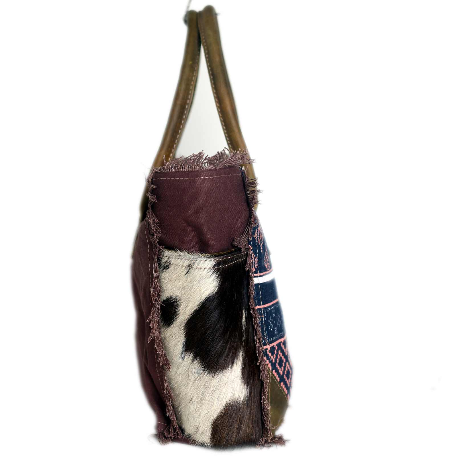 Challenger women's handbag made from upcycled canvas, and distressed brown leather. Shoulder bag comes beautifully accented with multicolored aztec design. Tote includes a rolled leather handle for comfort. This practical, lightweight, and conveniently sized roomy bag is made sturdy to endure everyday use. Perfect choice for school, work, travel, and weekend trips. Main compartment has a full zipper closure with a wide opening to easily access your belongings. The fully lined interior also features a side zippered pocket, and two open pockets for additional storage. Side pocket accented with cowhide stores easily reachable items. The antique finish brass hardware nicely ties the bag together. Bag measures 13.5" L x 9.5" H providing plenty of room for all of your everyday essentials.