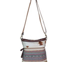 Challenger women's handbag made from upcycled canvas and full-grain leather accents. Shoulder bag features a multicolor design, with cowhide accents. This practical, lightweight, and conveniently sized roomy bag is made sturdy to endure everyday use. Includes a removable shoulder strap. Perfect choice for school, work, or travel. Main compartment has a full zipper closure with a wide opening to easily access your belongings. The fully lined interior also features a side zippered pocket, and two open pockets for additional storage. There are also zippered pocket at the front, and back of bag to store easily reachable items. The antique finish brass hardware beautifully ties the bag together. Bag measures 13.5" L x 12.5" H providing plenty of room for all of your everyday essentials.
