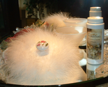 The marabou trimmed faux fur puff is accented with a rose painted ceramic handle.