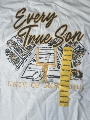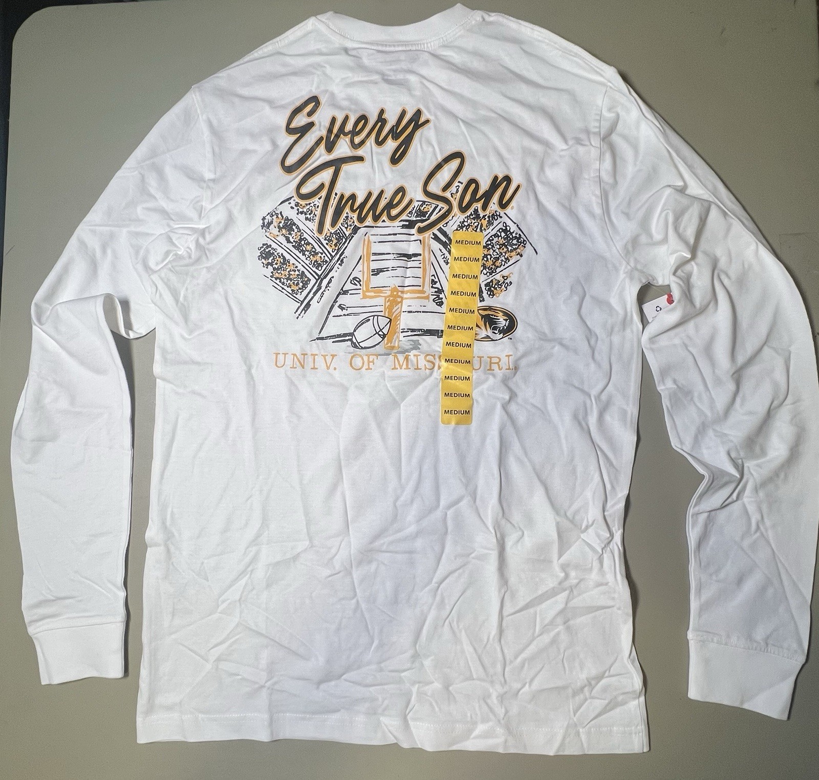 The Champion University Of Missouri Mizzou ?Every True Son? Men?s White LS T Shirt is a stylish and comfortable way for fans of the Missouri Tigers football team to show their support. Made by Champion, this shirt features the team's logo and is designed specifically for men in size M. The white color adds a classic touch to the overall design, making it a versatile piece for any fan's collection. Perfect for game days or casual wear, this shirt is a must-have for any Missouri Tigers fan.