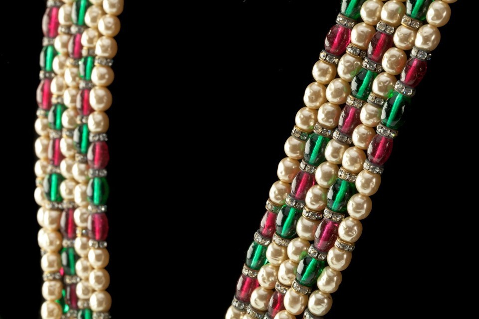 Features 5 Increasing Strands of Alternating Faux Pearls and Gripoix Green and Red Beads with Crystal-Studded Elements