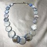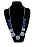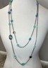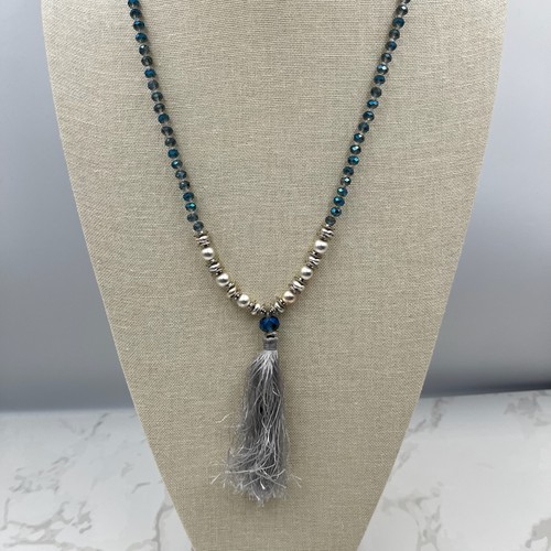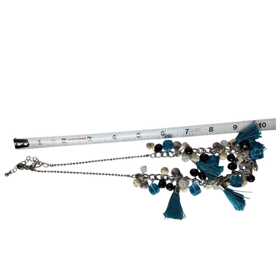 - Charming Charlie Silver Tone Necklace Teal Aqua Blue Tassel Beaded Square Shell