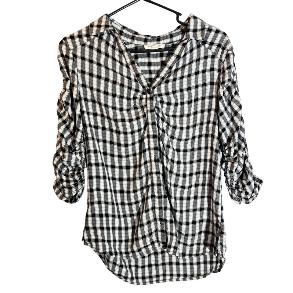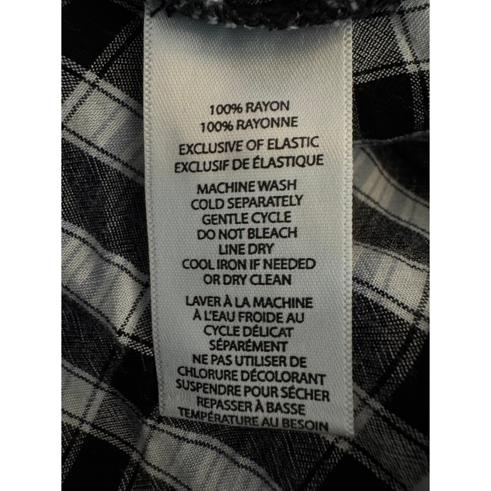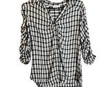 This Charter Club blouse features a striking black and white paisley print with a flattering V-neckline and ruched detail at the bust. The 3/4 sleeves and soft, stretchy knit fabric make it both comfortable and stylish. Made from a polyester-spandex blend, this versatile piece pairs perfectly with slacks for work or jeans for a casual day out.